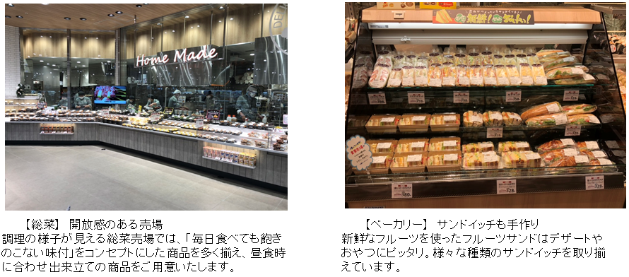 ≪味にこだわった手作りのお総菜≫各生鮮食品の売場では、店内で販売している素材を使用したフレッシュサラダやカットフルーツを始め、店内で手作りした煮魚・焼魚、お肉総菜を取り揃えます。また、オープンキッチンで見通しの良い総菜・ベーカリー売場では、種類豊富なお総菜やサンドイッチなど、素材にこだわったサミット自慢の商品をご用意いたします。