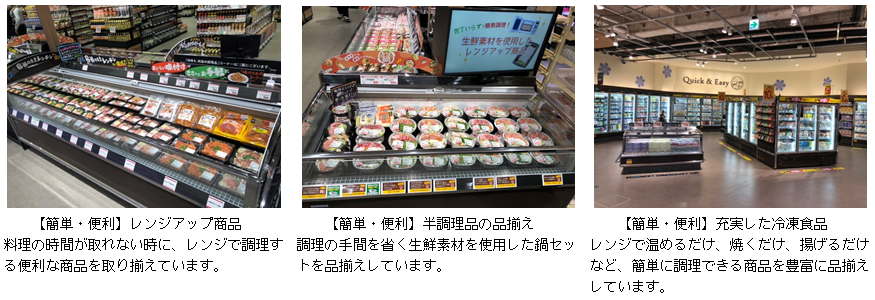 ≪種類豊富な簡便商品≫短時間で簡単においしい料理が完成するレンジアップ商品や鍋セットなどのミールキットを種類豊富に品揃えします。また、冷凍食品コーナーではお弁当のおかずからメイン料理になる商品まで取り揃えるほか、鮮魚・精肉売場でも保存しやすい冷凍素材を取り扱いいたします。