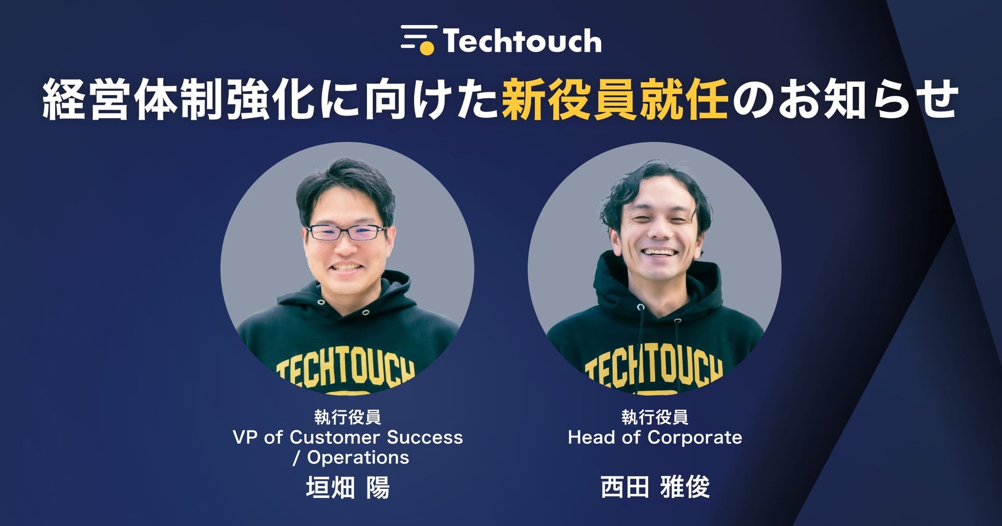 デジタルアダプションプラットフォーム(DAP)国内シェアNo.1の「テックタッチ」を開発・提供するテックタッチ株式会社(本社:東京都港区、代表取締役 CEO:井無田 仲、以下 当社)は、経営体制の強化に向けて執行役員 VP of Customer Successの垣畑 陽が、新たに執行役員 VP of Customer Success / Operationsに、西田 雅俊が執行役員 Head of Corporateに就任したことをお知らせいたします。