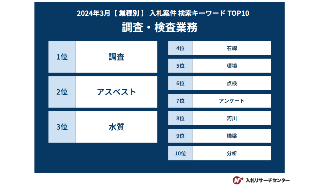 業種カテゴリ別案件数で前月より増加していた「調査・検査業務」をピックアップし、入札検索キーワードランキングTOP10を発表いたします。