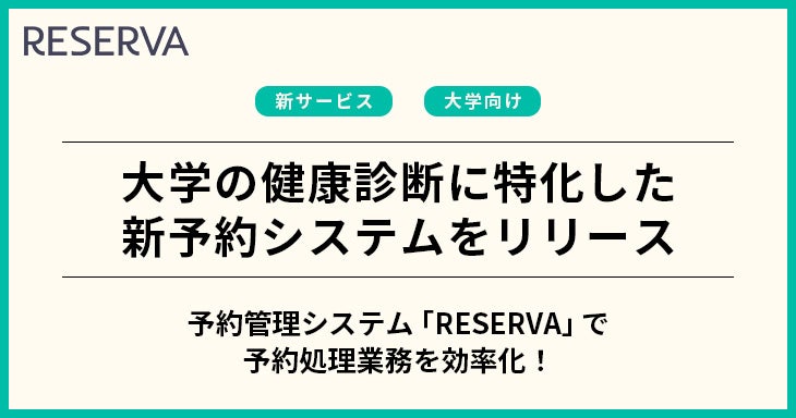 RESERVA(https://reserva.be)は、教育・学習支援業など350業種以上に対応した業界最大級の予約システム。導入社数は26万社を超え、地方自治体や公共施設でも利用されているほか、最近では大学での導入も進み、オープンキャンパスや文化祭をはじめとした学内行事の予約に活用されている。新年度を迎えるにあたって、毎年4~6月にかけて健康診断を実施する複数の大学から、より効率的な運営プロセスを構築したいとの相談を受けて、健康診断の予約に特化したシステムのリリースに至った。