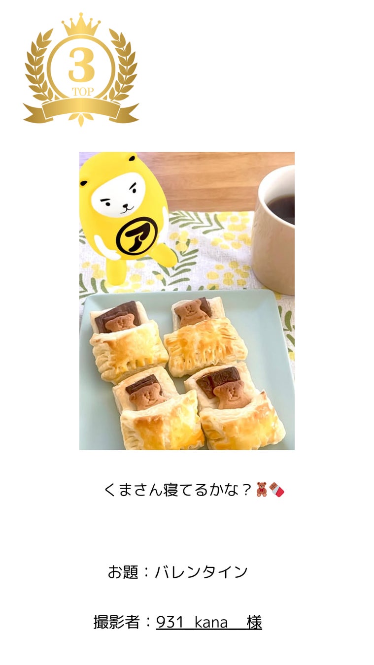 娘さんと一緒に作ったチョコレートを並べ、べあ~君にも「ひとつどうぞ」と声をかけるような気持ちのこもった投稿。家族で過ごす何気ない時間を写真から感じ取れることができます。べあ~君が加わることで、思い出がより楽しい一枚になっています。