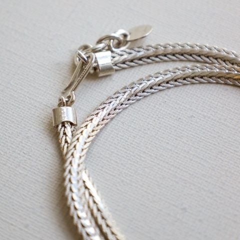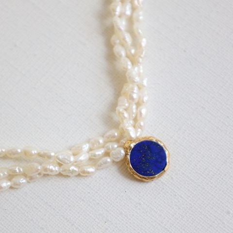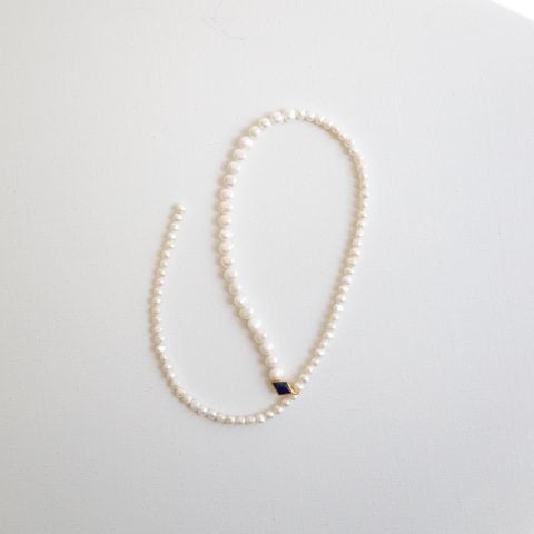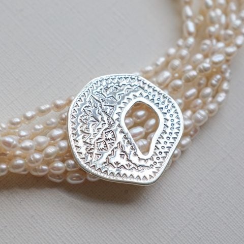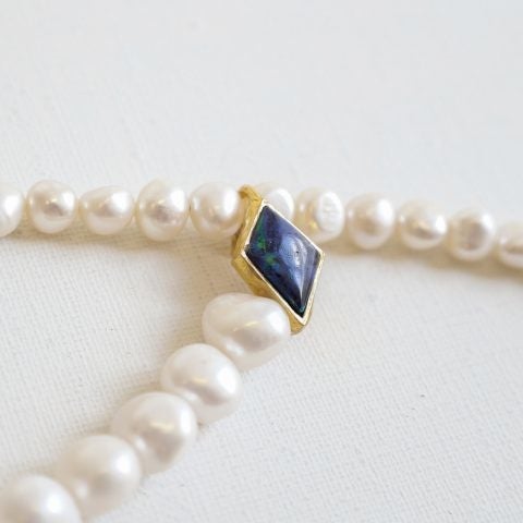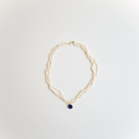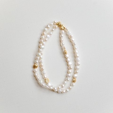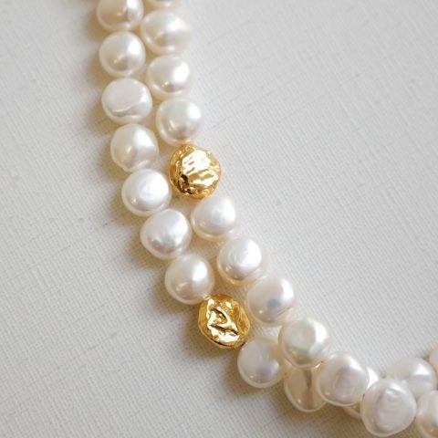 小粒のバロックパールを編み込んだような3連になったシルエットに