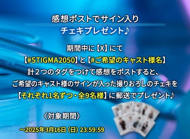 期間中にX(旧:Twitter)にてハッシュタグ【#STIGMA2050】と【#ご希望のキャスト様名】計2つのタグをつけて感想をポストすると、ご希望のキャスト様のサインが入った撮りおろしのチェキを【それぞれ1名ずつ・全9名様】に郵送でプレゼントいたします。