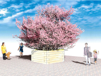 なんば広場は、なんば駅周辺の空間再編推進事業整備プランに基づき、上質で居心地の良い空間の創出を目指す社会実験を行なっています。復興『桜祭り』では、広場に桜の木を設置し、憩いの空間創出のあり方を検証します。