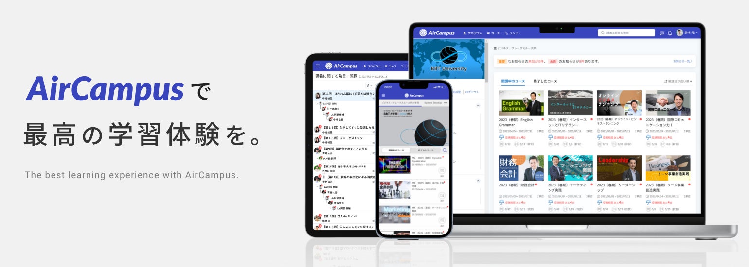 AirCampus®︎は、株式会社Aoba-BBTが独自に開発したオンライン教育クラウドシステムです。このシステムは、PC、スマートフォン、タブレット端末に対応しており、世界中どこからでもインターネットを通じて講義に参加することができる「オンライン空間上のキャンパス」を実現しています。