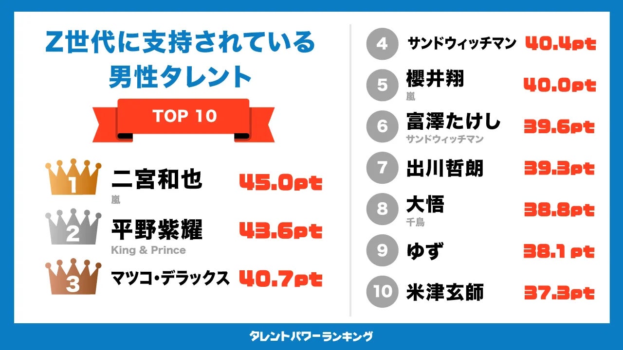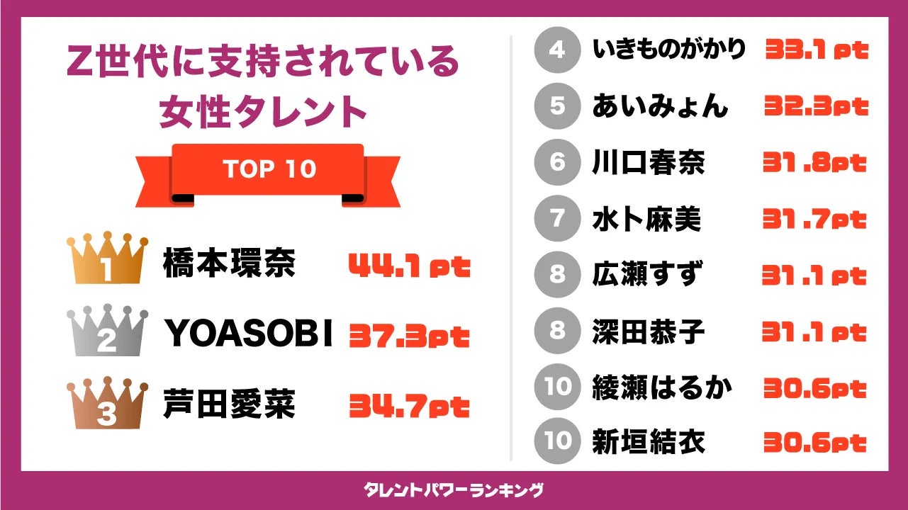 『タレントパワーランキング』では、タレントパワーランキングに登録されている男性タレント&女性タレントについて、Z世代(10代~20代前半)が回答した結果のスコアを調査。