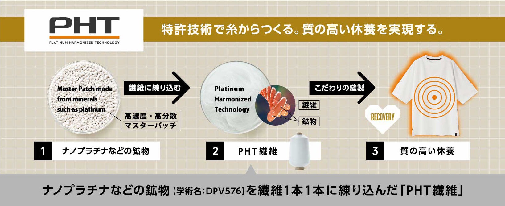 ※PHT(Platinum Harmonized Technology)は、当社独自の先端テクノロジーを駆使し、ナノプラチナなどの鉱物を繊維1本1本に練り込んで開発した特殊繊維です。「PHT」を使用し、「人間が本来持っている自己回復力を最大限に発揮させること」を目的につくられた「リカバリーウェア」は、休養時の体を優しく包み込み、心身の“休養”をサポートします。