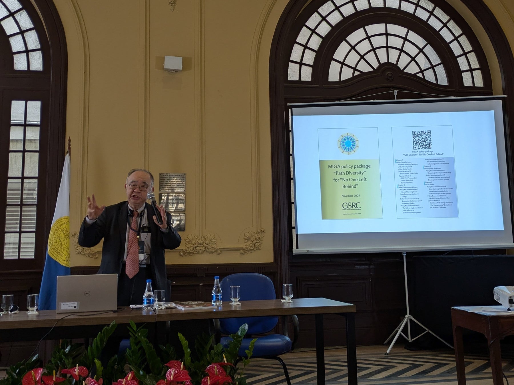 武蔵野大学国際総合研究所(所長:西村 英俊)は、2024年5月より「グローバルサウス研究会」を実施し、グローバル・サウス台頭による新たな国際秩序の基本的方向性を示すビジョンの策定を進めてきました。その結果として、取りまとめられた政策提言集「悉皆成長のための多様性経路」を今回、11月11日、12日のT20(G20に併催されるシンクタンクの協議体)サミットにおいて配布・説明し、11月13日のT20サイド・イベント・セミナー(A High-level T20 side event reflecting Global South Aspirations : Innovative Strategies for Disaster Resilience)、11月14日のG20 Social Summitにおいて、「Fortifying Global South Economies through Dynamic Governance Solutions」のテーマで発表・討議しました。その後、前議長国インドのG20シェルパ(首席政府代表)であるH.E. Amitabh Kant氏、ブラジル駐箚インド特命全権大使H.E.Suresh Reddy氏等と本報告書に関する協議を行いました。11月15日には、議長国ブラジルのG20シェルパを通じて、参加国のG20シェルパ全員に報告書40冊を配布し、情報共有を行いました。