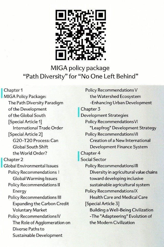 このような時代の変化に対応し、グローバル・サウス台頭後の新しい時代の構造を示すビジョンを示すことを目的として、武蔵野大学国際総合研究所「グローバル・サウス研究会(MIGA-GSRC)」は、『「No One Left Behind」のための多様性経路政策提言』(以下、MIGA-PP)を作成しました。SDGsのスローガンである「No One Left Behind」、とは、悉皆成長、即ちヨーロッパ人だけではなく、アジア人も、アフリカ人も、地球上の全ての人々が近代化を推進し、経済成長できることを示しています。MIGA-PPはそのような新しい時代の基本的方向性を示す政策提言集です。