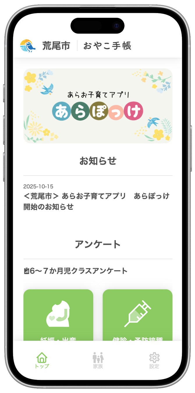 荒尾市からのお知らせを月齢・年齢にあわせてタイムリーに受信できる「メール配信・プッシュ機能」、予防接種漏れや接種間隔ミスを防ぐことができる「予防接種AIスケジューラー」、成長グラフや乳幼児健診の記録など母子健康手帳の内容をマイページに記録できる「電子母子健康手帳機能」などの機能をご利用いただけます。