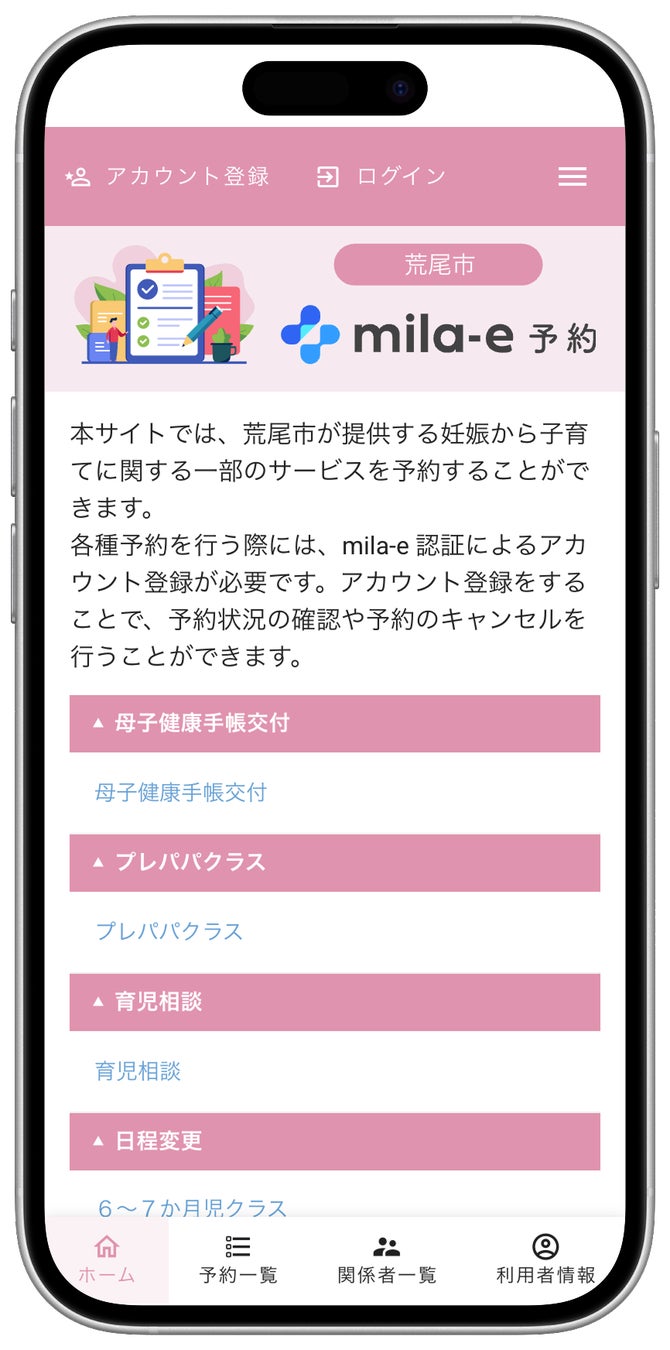 mila-e おやこ手帳 TOP画面の「各種予約」からアクセス後、お持ちのmila-e 認証アカウントにてログイン、利用者情報を入力し予約を行ってください。