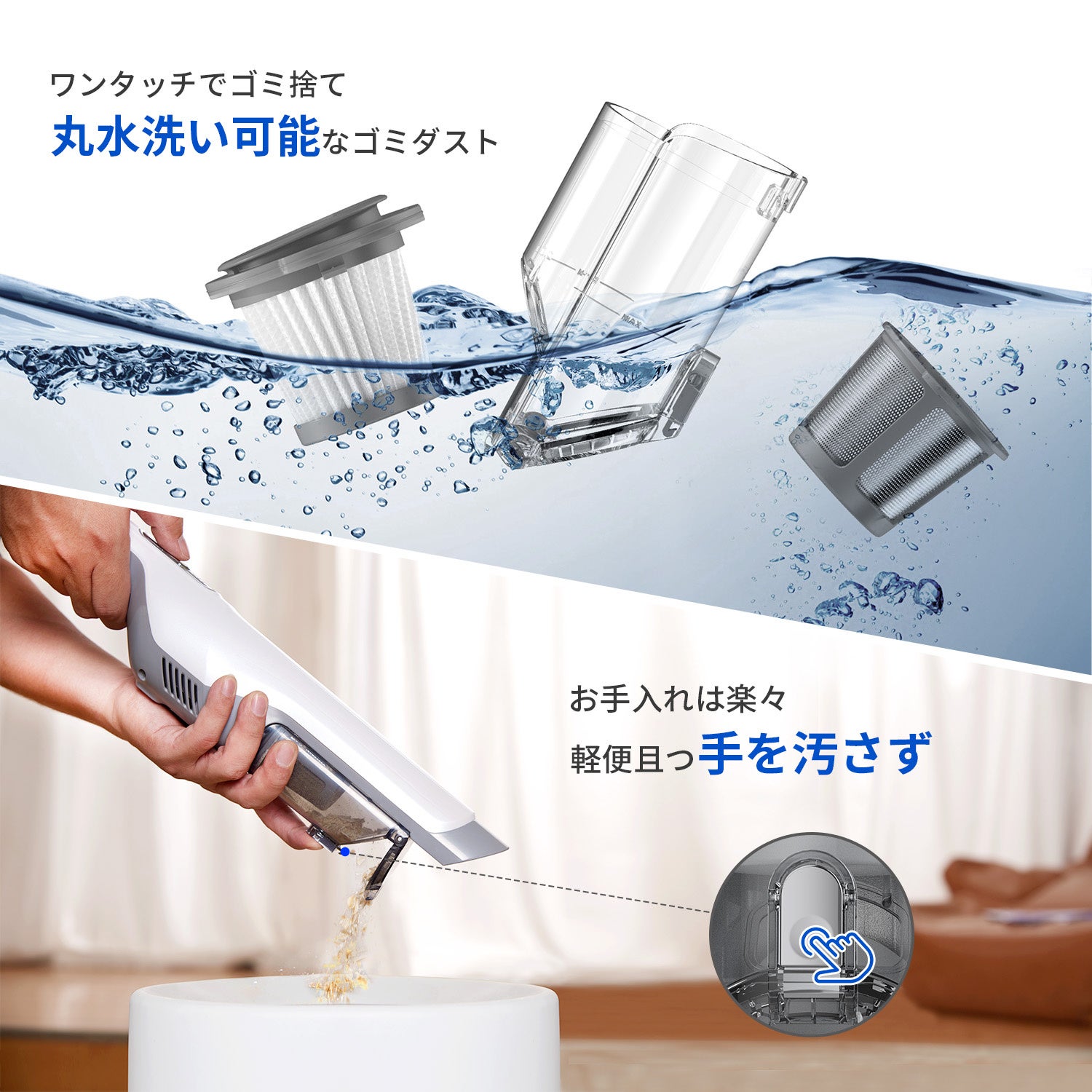 ワンタッチでゴミを捨てることができる専用のボタンを装備。また、金属メッシュと高品質なHEPAフィルターは、簡単に取り外し、清掃できます。長寿命なフィルターで、経済的で環境にもやさしいです。