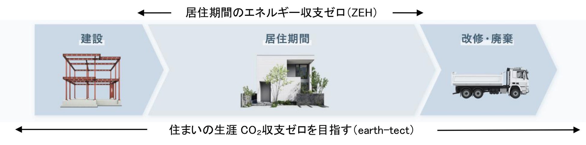 ※4.達成には当社規定の仕様の採用と、ヘーベル電気(earth-tect用)への20年間の加入が必要です。また、プランや仕様によっては達成の時期が前後する場合があります。LCCO₂排出の考え方は、環境性能評価ツールであるCASBEE-戸建(新築)2018年版に準拠。一次エネルギー消費量はエネルギー消費性能プログラム(住宅版)により算定、ならびに、“LCCM低層共同住宅部門の基本要件(LCCO₂)適合判定ツール2024年版 ver.2.0”を参照