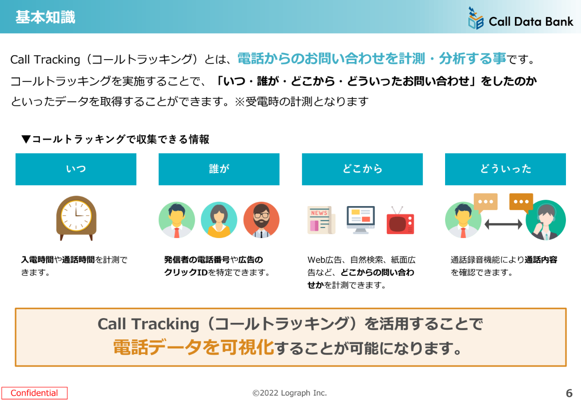 そこで今回、コールトラッキングツール「コールデータバンク」を販売している株式会社ログラフと共同で、コールトラッキングを活用したリスティング広告の改善方法を公開いたしました。コールトラッキングツールの基本知識から、リスティング広告におけるコールトラッキングツールの活用方法、導入事例までを詳しく解説しております。