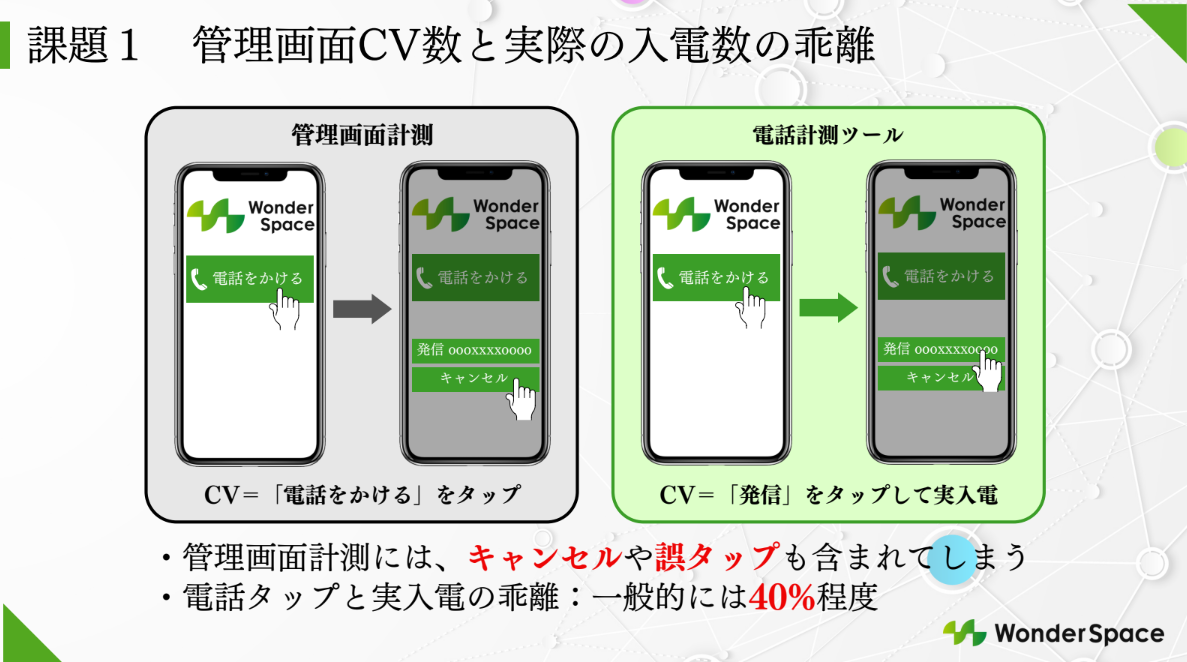 多くの企業様がリスティング広告のコンバージョンポイントの1つとして電話お問い合わせを活用していますが、電話番号をタップした人(広告管理画面で計測されたコンバージョン数)と実際の架電数が乖離しているケースがあります。一般的に、電話番号をタップした人のうち、実際に架電する人が50〜60%程度であるため、広告管理画面上の計測数と実際の架電数に差が生じています。