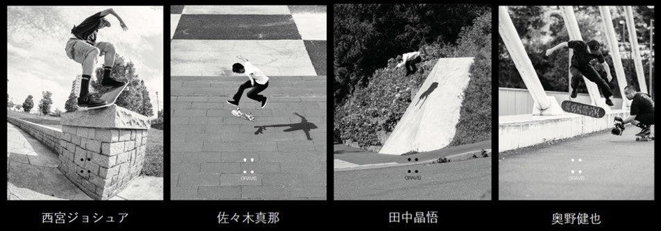 オリジナルメンバーである奥野健也をチームマネージャーに据え、和製ディラン・リーダーの呼び声も高い若手有望株の佐々木真那、アグレッシブなライディングで国内随一のスキルを誇る田中晶悟、さらには生まれ持った強靭なバネと繊細な動きも得意とする西宮ジョシュアという名だたるライダーが揃った少数精鋭で構成をされています。スケートスキルはもちろん、そのスタイルやファッションにまで深くこだわったライダーが揃うgravisチームには国内外から大きな注目を集めています。