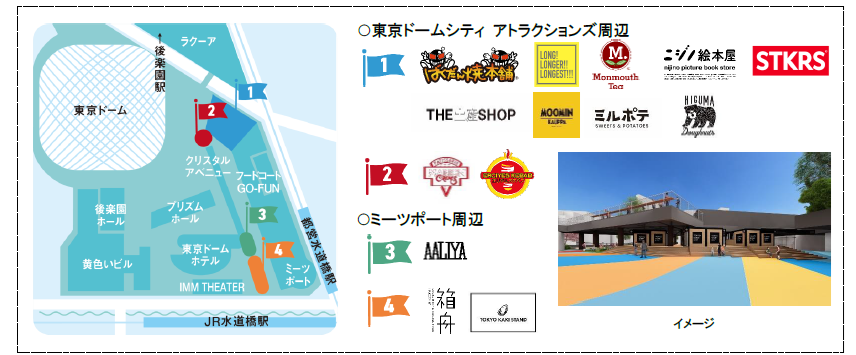 外はカリカリで中はトロトロの新食感が味わえる「ばくだん焼本舗」や、“日本一”長い食べ物を集めた「LONG! LONGER!! LONGEST!!!」、千駄ヶ谷の人気紅茶専門店「モンマスティー」など食べ歩きやおやつにぴったりの飲食店舗のほか、オリジナリティあふれる絵本が並ぶ「ニジノ絵本屋」、北欧の雑貨や食品が揃う「ムーミンカウッパ」、東京ドームシティオリジナルのお土産が購入できる「THE土産SHOP」などバラエティ豊かなグッズ店舗が登場します。