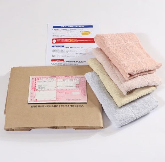 衣類等を詰める回収袋・回収キットのご利用方法・返送用着払い送り状・タオル(オーガニックコットン格子柄・4枚組)が同梱されています。