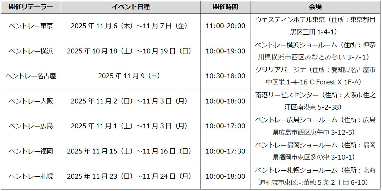 また、ベントレーモーターズ ジャパンは、待望の日本デビューを記念し、全国の正規販売店にて特別イベント「Continental GT Azure Debut Fair」を開催いたします。この日のためにご用意したエクスクルーシブな体験を通じて、ベントレーの真髄をご体感ください。エレガントなデザイン、比類なきクラフツマンシップ、そして贅沢で快適な乗り心地、そのすべてを一度に体感できる「Continental GT Azure Debut Fair」へ、ぜひお越しください。