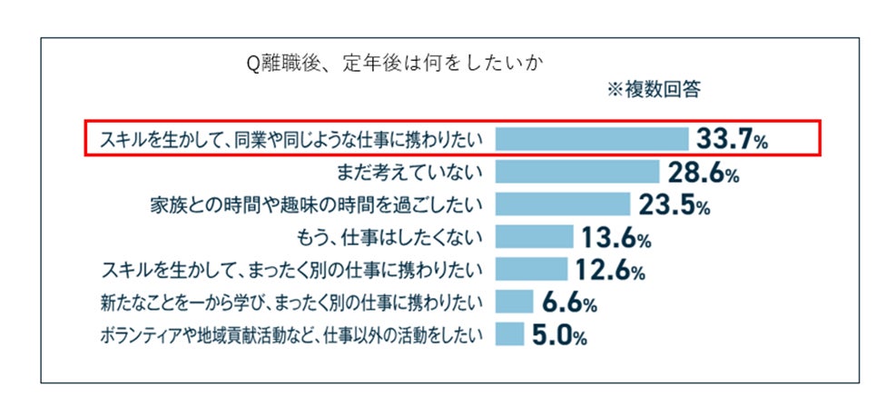 定年後、もしくは離職後の希望について聞いてみると、「スキルを生かして、同業や同じような仕事に携わりたい」がもっとも多い33.7%。次いで、「まだ考えていない」(28.6%)、「家族との時間や趣味の時間を過ごしたい」(23.5%)となった。