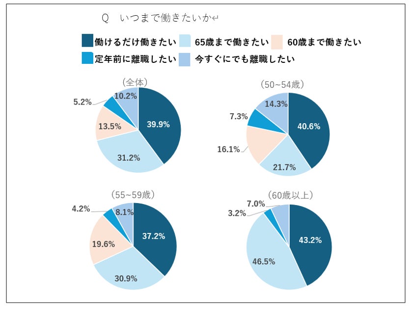 「現在の会社でいつまで働きたいですか」という質問では、全体の39.9%が「働けるだけ働きたい」、31.2%が「65歳まで働きたい」と回答。なかでも60歳以上は9割弱が「働けるだけ働きたい」「65歳まで働きたい」と回答した。