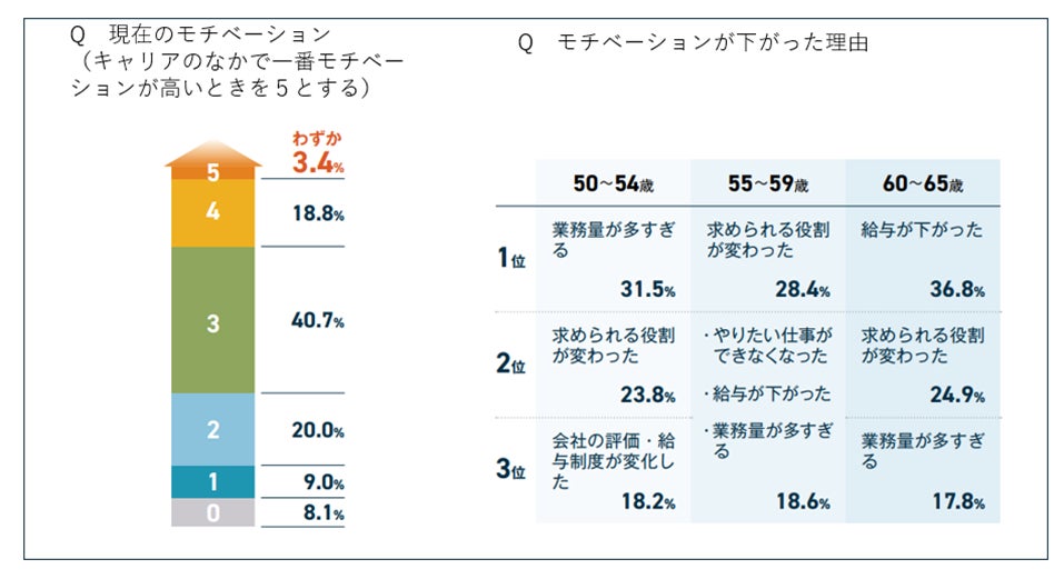 また、モチベーションが下がった人にその理由を聞いてみると、50~54歳では「業務量が多すぎる」こと(31.5%)、55~59歳では「求められる役割が変わった」こと(28.4%)、60歳以上では「給与が下がった」こと(36.8%)がもっとも多い結果となった。