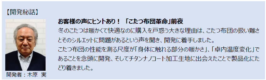 チタンナノコート加工(スパッタリング加工)(※)を施した生地をこたつ布団の裏地に使用する事で、優れた熱反射性能を実現、こたつに使用する綿を大幅に減らしても一般的なこたつ布団と遜色のない暖かさを実現しました。これにより「容積1/3」、「重量40%軽量」のこたつ布団を開発、汚れたら気軽に洗濯でき、シーズンオフにはコンパクトに収納出来る、軽くて薄いこたつ布団「KARUS・かるうす」です。