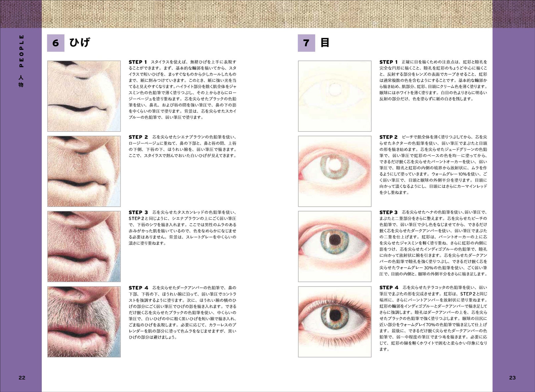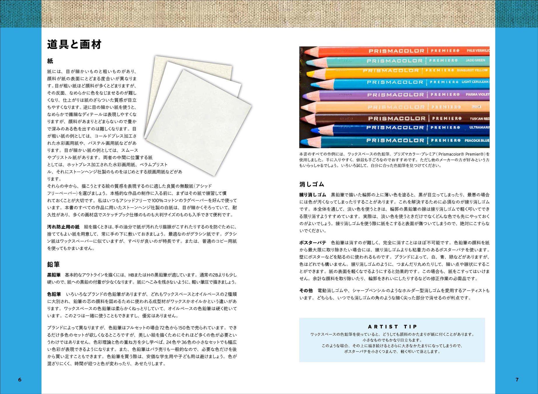 色鉛筆デッサンに使う道具と画材や基本的なテクニックの解説つき。巻末にはドリームワークス・アニメーションなどで活躍した著者の作品集も収録しています。