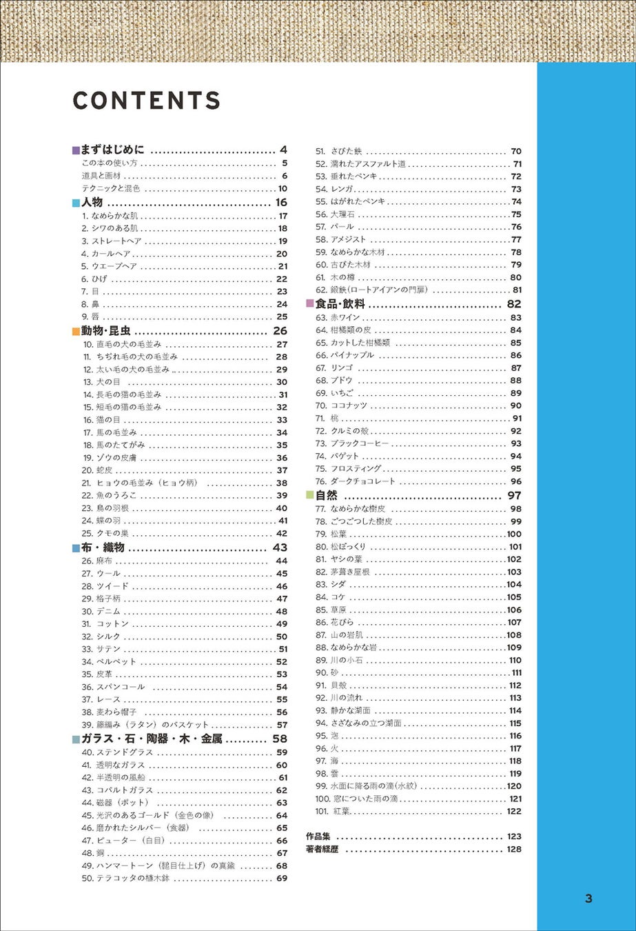 人、動物、テキスタイルから陶器、金属、自然事物まで、さまざまなテクスチャーの描き方を、手順を追って丁寧に解説するアーティスト必携の指南書です。