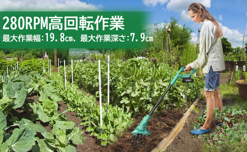 - この一台ミニ電動耕運機で家庭菜園や花壇の草削り作業や土ほぐしをして、肥料などを撹拌して、育てたい作物に適したうねを立てます。