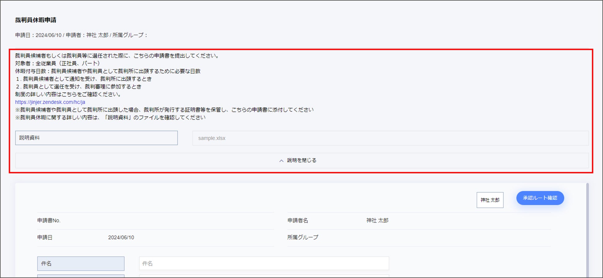 管理者が設定した申請書ごとの詳細説明内容は、申請時に従業員画面の上部に表示されます。これにより、従業員が申請書の利用用途を理解した上で、申請することができるようになります。