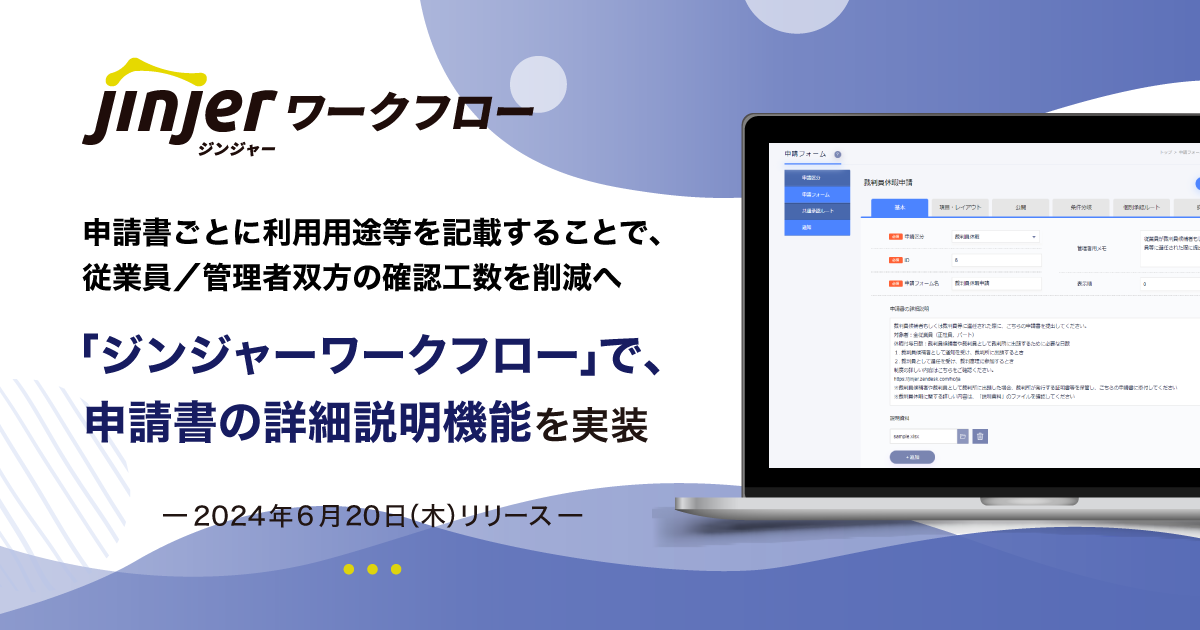 「ジンジャーワークフロー」で、申請書の詳細説明機能を実装申請書ごとに利用用途等を記載することで、従業員/管理者双方の確認工数を削減へ