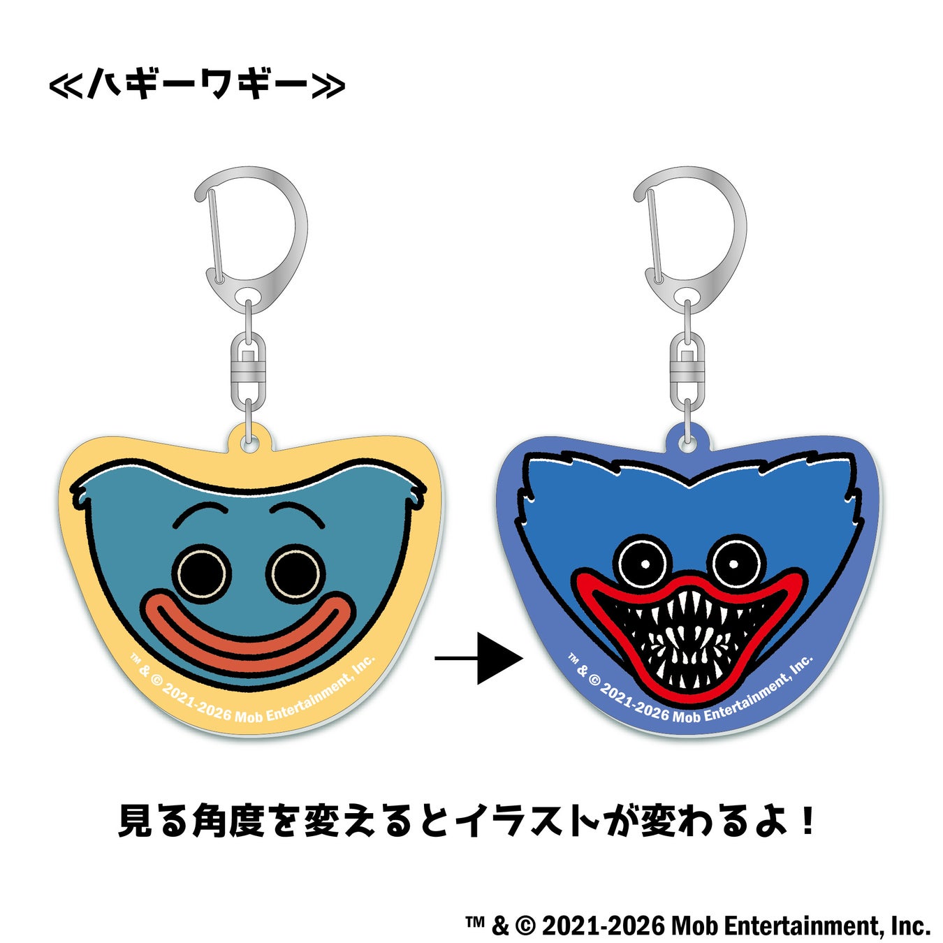 公式Xの人気投票で1位と2位だったキャラを商品化しました。見る角度を変えると絵柄が変わるキーホルダーでカートゥーンver.からモンスターver.に変化します。