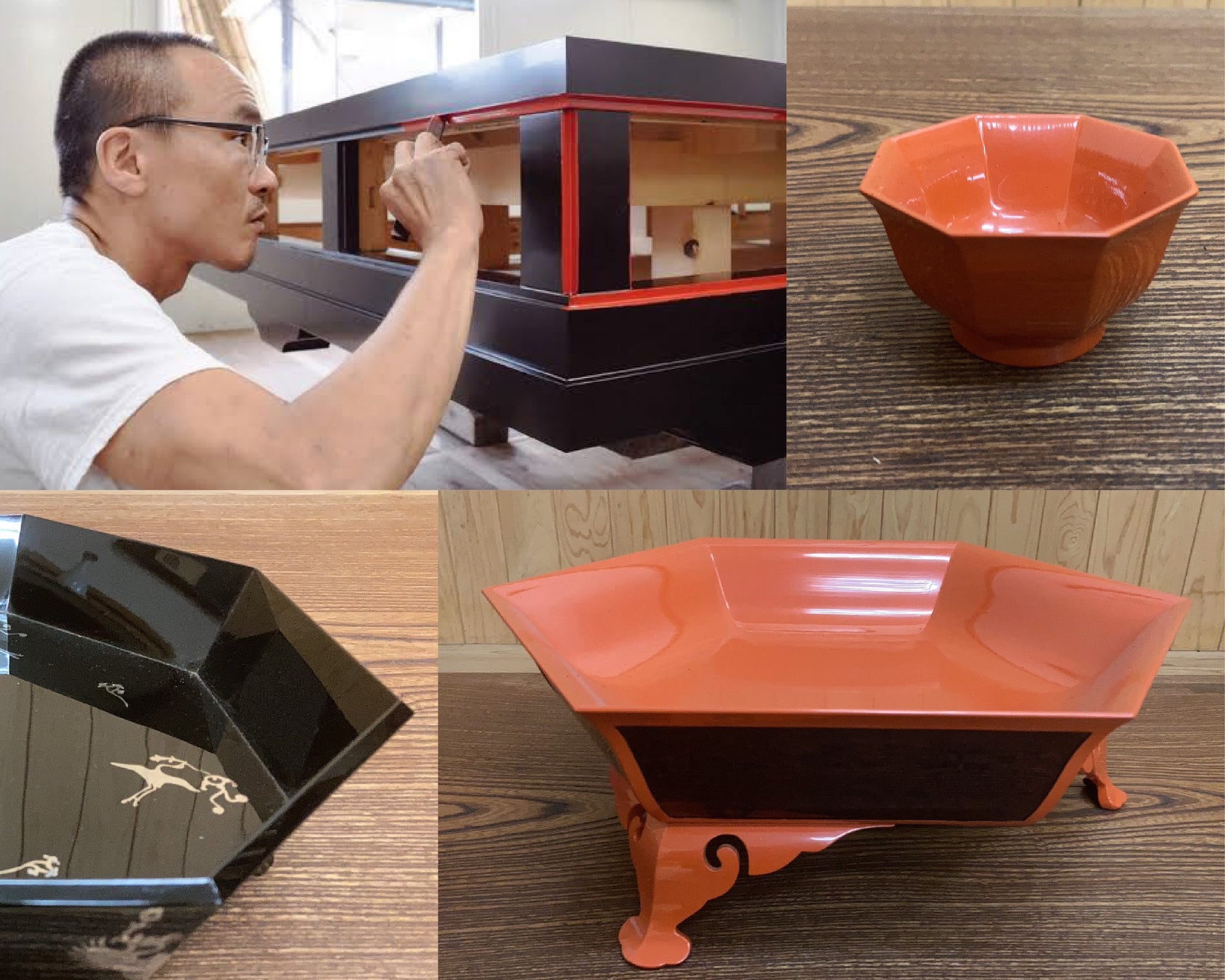 樽井氏は奈良の漆を扱う塗師の家に生まれ、父である春日大塗師職預、樽井禧酔氏に師事。近年では手向山八幡宮、御鳳輦( ごほうれん) 新調、興福寺中金堂、薬師寺東塔にも携わられています。