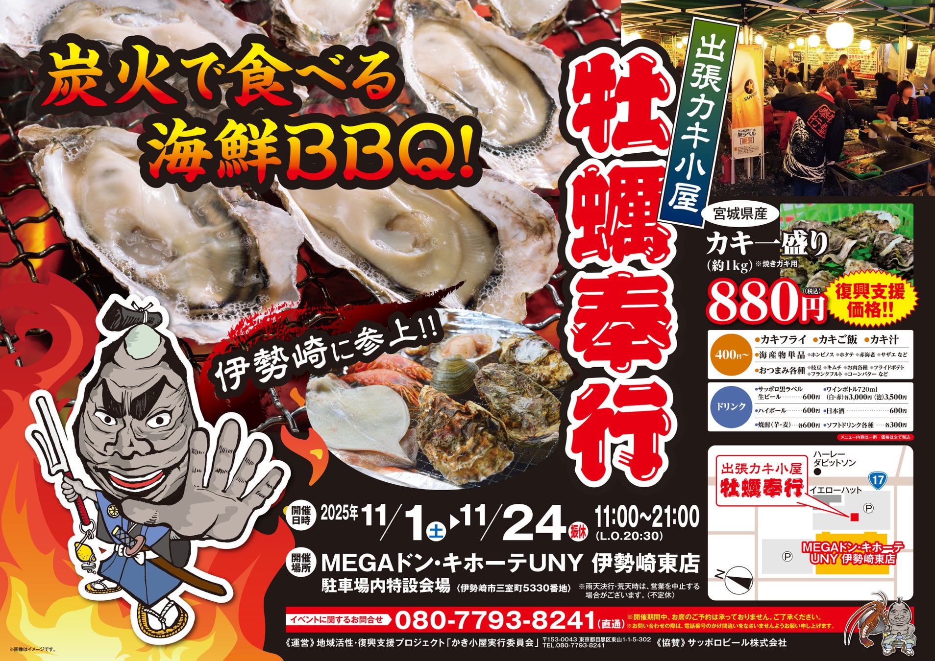 群馬県伊勢崎市に「出張カキ小屋」参上! 11月1日〜 MEGAドン・キホーテUNY 駐車場特設会場で期間限定開催!《 宮城県産殻付き牡蠣が約一盛り880円!! 》