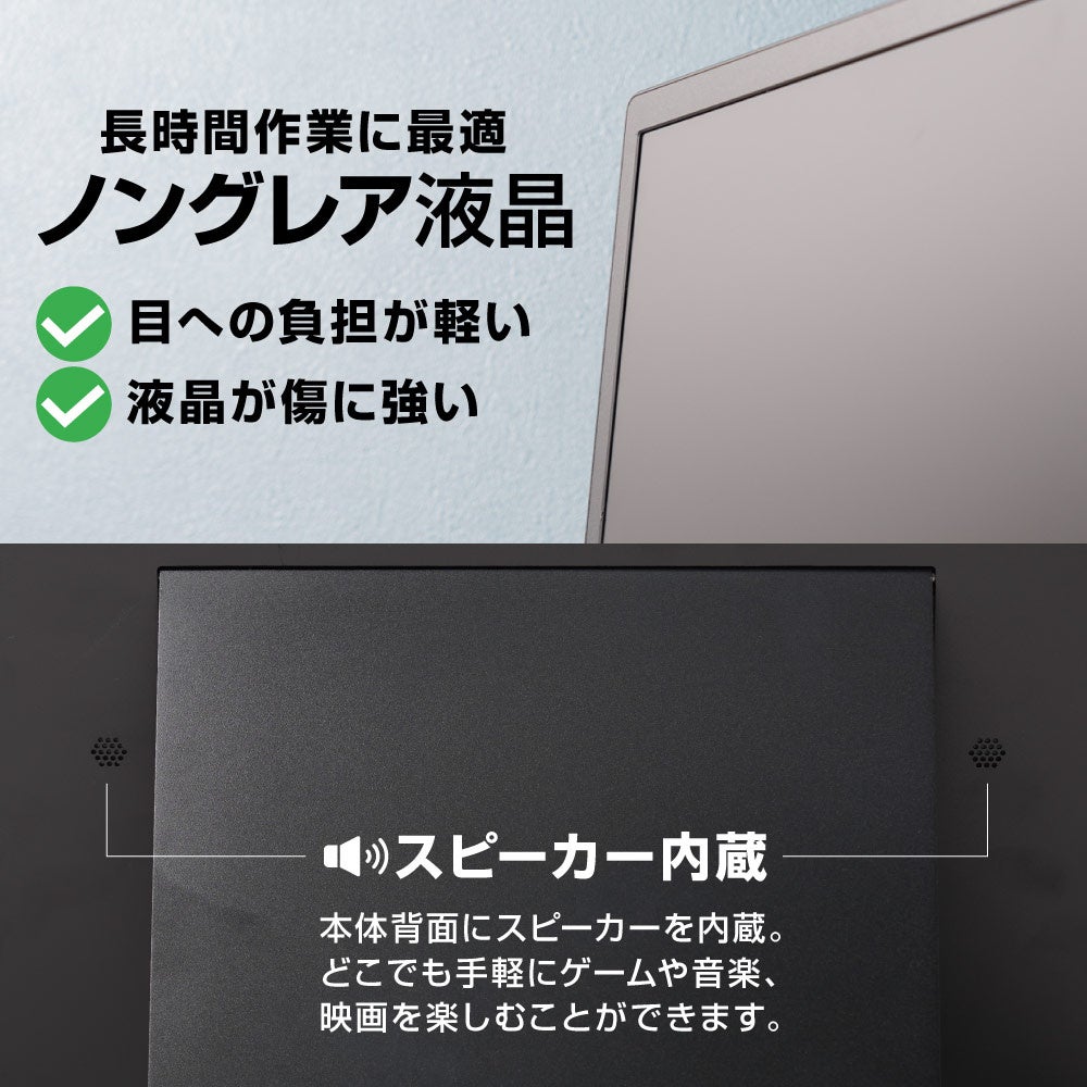セッティングは付属のType-Cケーブルのみでパソコン(Type-C映像出力可能なPC)との接続は完了。さらに電源もパソコンから供給し使いたいときにすぐに使えます。PCのバッテリーを消費したくない場合には別途電源供給用の端子にType-Cケーブルを接続する方法も可能。本体にはminiHDMI端子を備え、HDMIで接続も可能。パソコン以外にもHDMI接続でゲーム機のモニターとしてもお使いいただけます。1920×1200のWUXGA解像度。14インチサイズの画面を2枚搭載。2枚の画面をそれぞれの画面として映す拡張モード、2枚の画面を1画面とし大きな画面で操作ができるフルスクリーンモードを搭載。目に優しいノングレア液晶を採用。スピーカー内蔵。画面の角度は無段階に調整可能。背面に引き出し式のスタンドを内蔵。