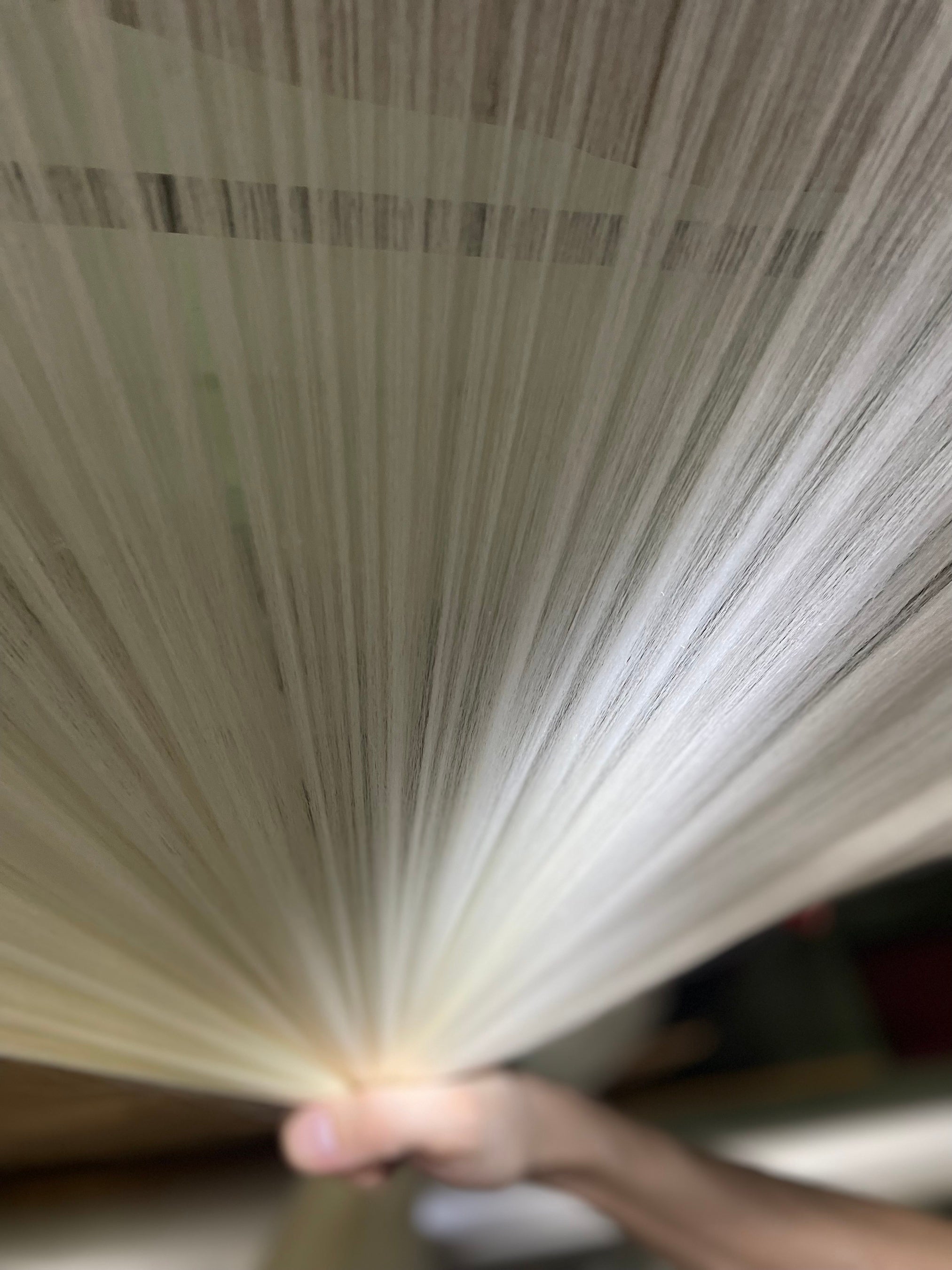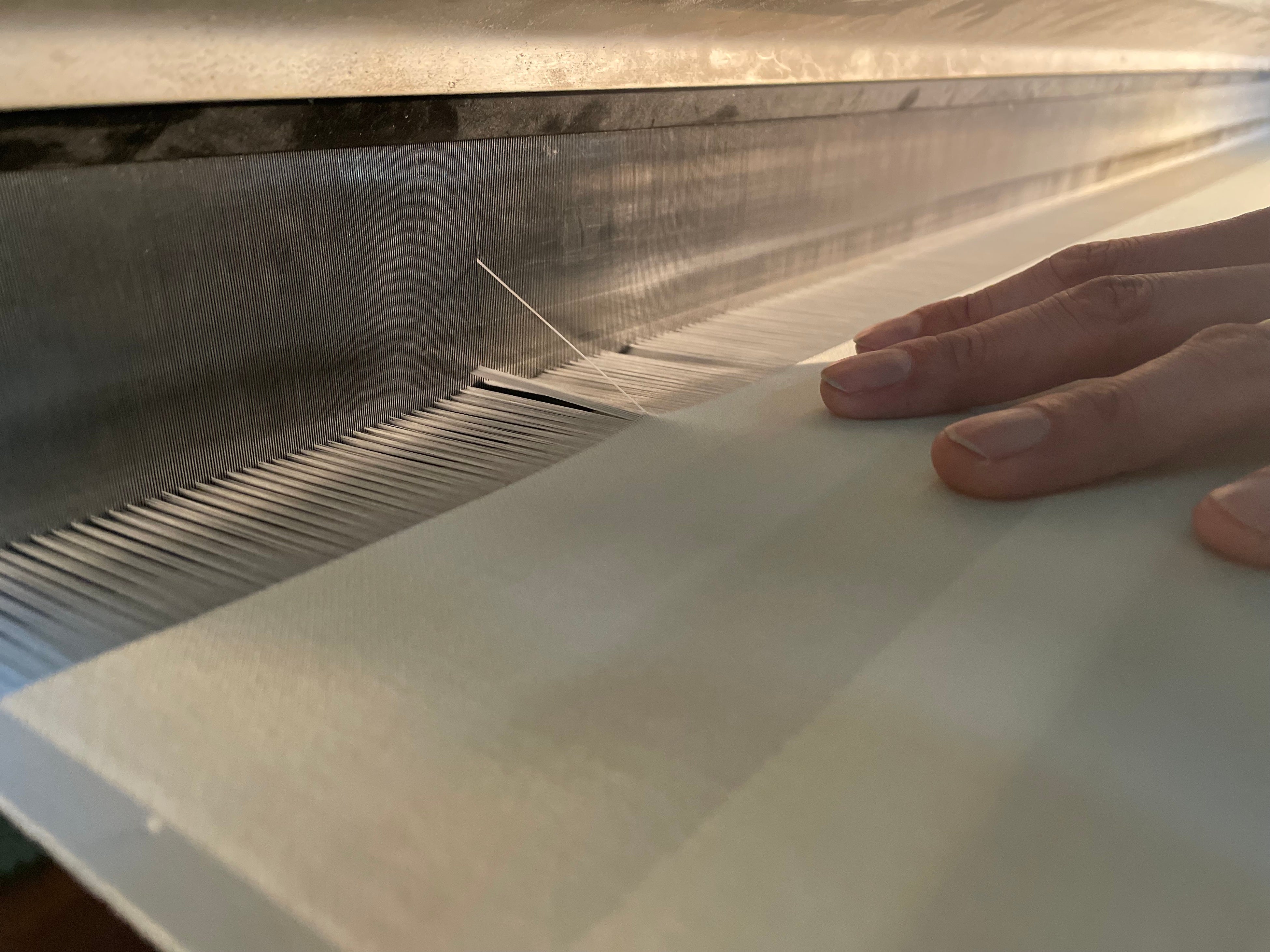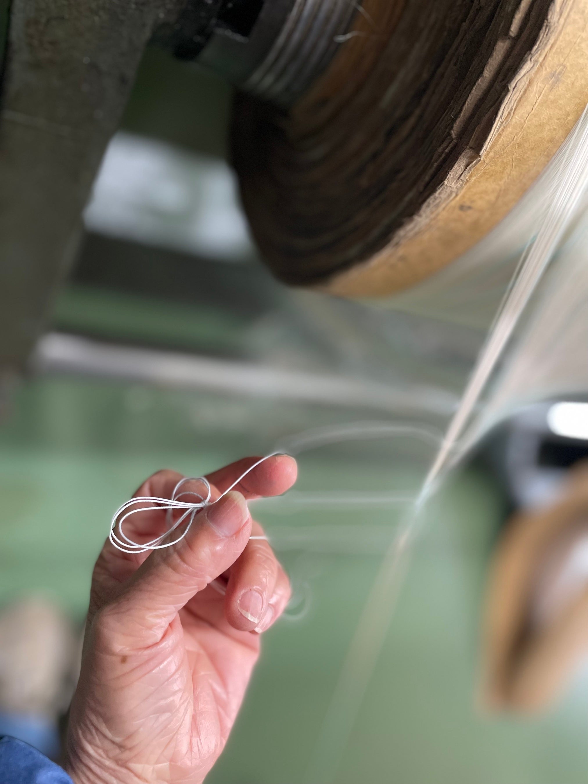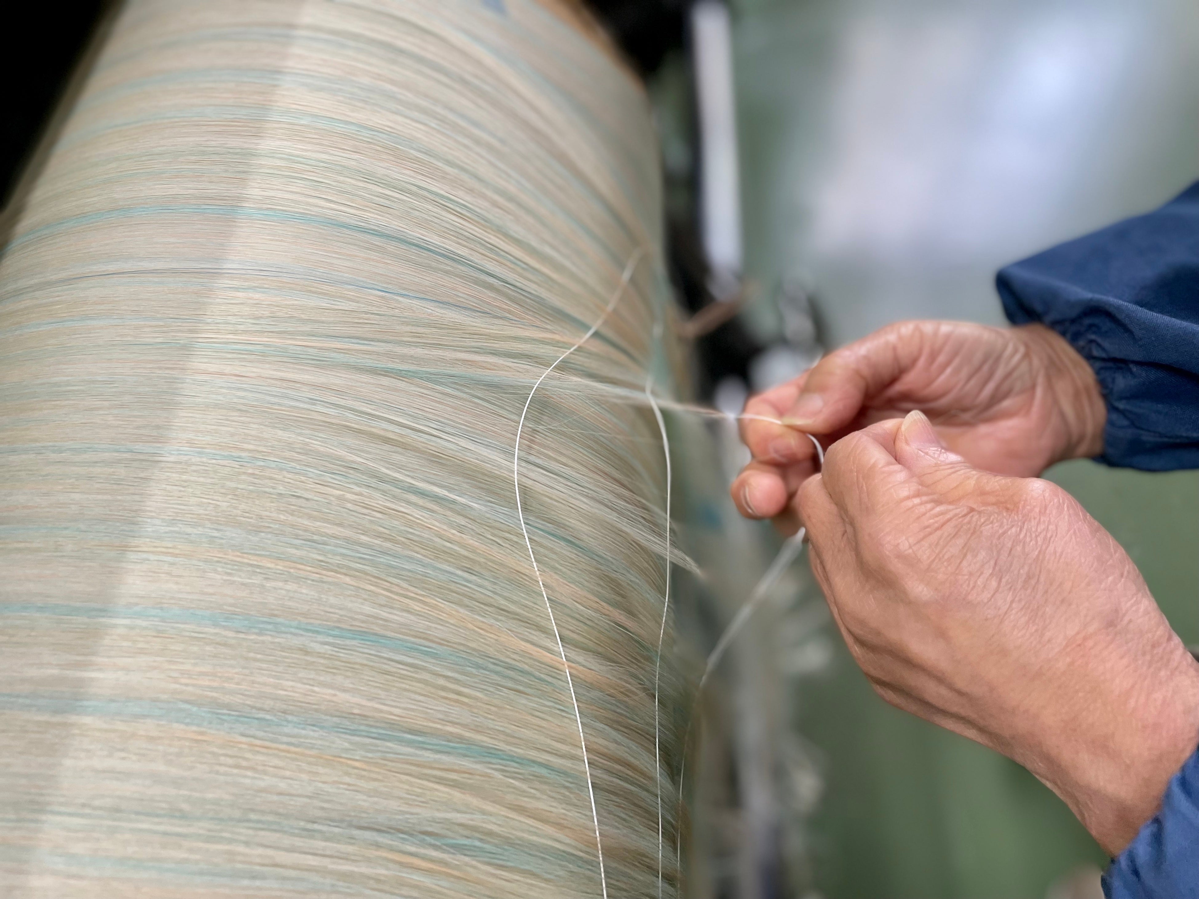 「小倉織物」では、日本で希少な1960年代の織機を使用。ジャガード生地を織るには、経(たて)に1万本以上の糸を職人が手作業で1本ずつ機械にセットするという、非常に繊細で高い技術が求められます。通常の生地は経糸(たていと)を2本撚って*織りますが、「小倉織物」の生地は、非常に細い経糸(たていと)を撚らずに2本並べて織ることで、上品な光沢感を出すことができ、柔らかく滑らかな手触りに仕上がります。