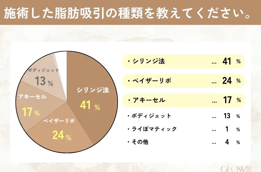 施術方法については、「シリンジ法」が41%と最も多い結果に。シリンジ法は注射器を用いるため、医師の技術力が重要であることが特徴です。次いで「ベイザーリポ」(24%)、「アキーセル」(17%)が選ばれています。