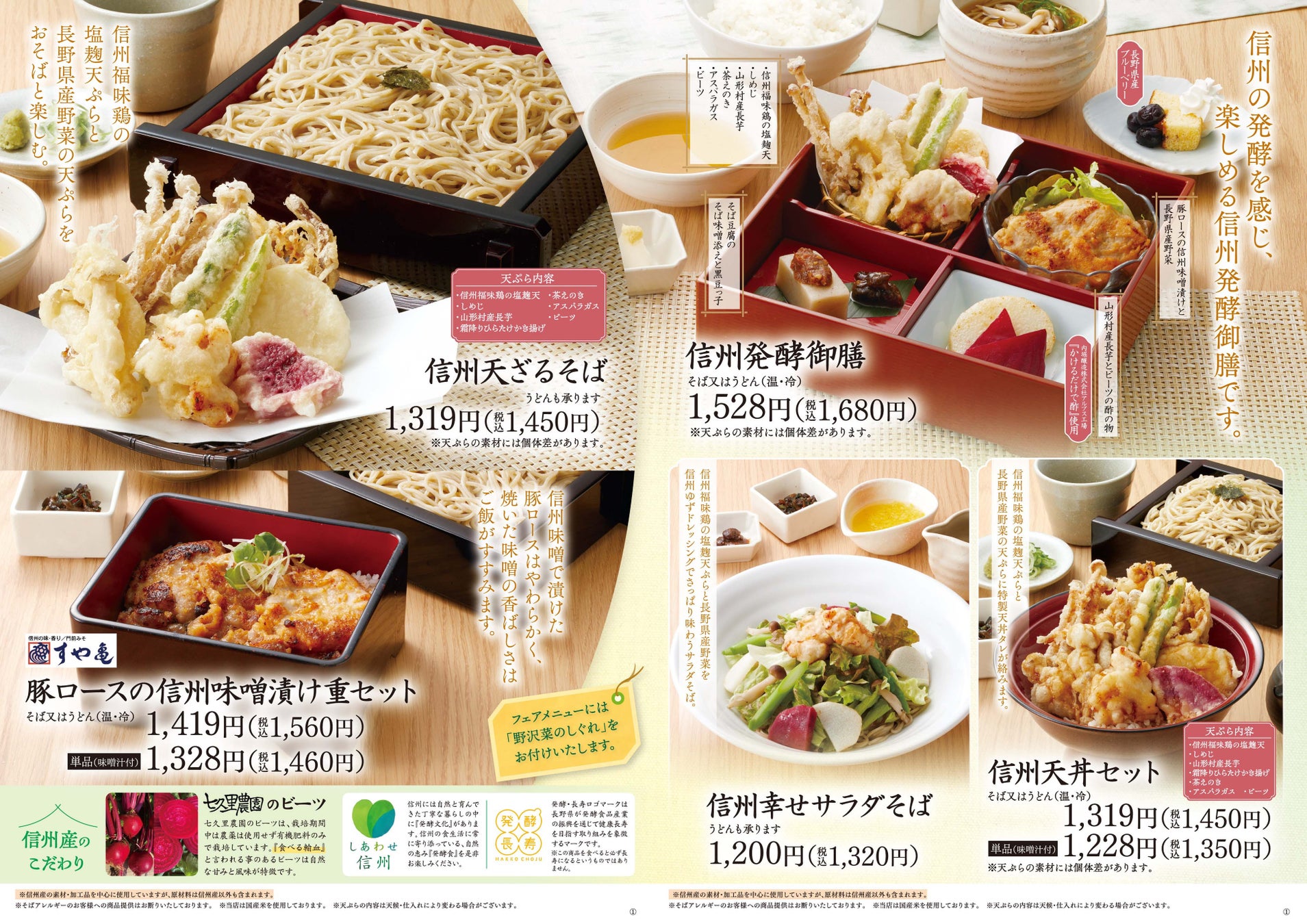 長野県産の野菜を使用した毎年人気の「信州天ざる」、「信州天丼」はもちろん今年も野菜がたっぷりのった「信州幸せサラダそば」もご用意しております。また新たに信州の発酵食材をもっと楽しんでいただける「信州発酵御膳」もご用意しております。