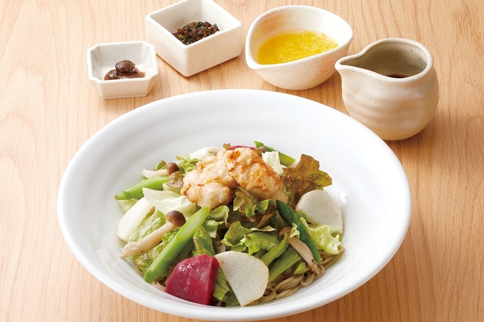信州福味鶏の塩麹天と長野県産野菜を信州ゆずドレッシングでさっぱりと味わうサラダそば。