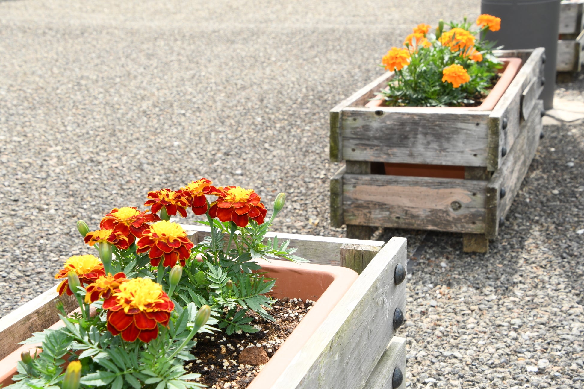 この取り組みは、高山市民憲章推進協議会が実施する「花いっぱい運動」の一環として、同校が毎年協力しているものです。今年は新たに、色鮮やかなマリーゴールドを中心としたプランター60基を設置しました。