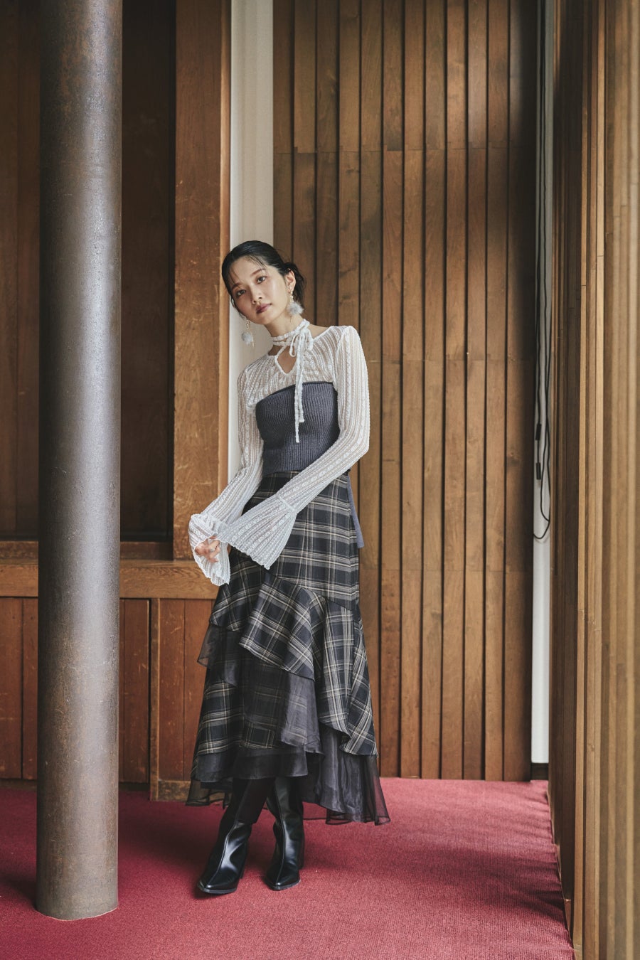 甘さを忍ばせたレースにニットビスチェの立体感を重ねて。ティアードスカートが揺れる、上品なレイヤードスタイルに。