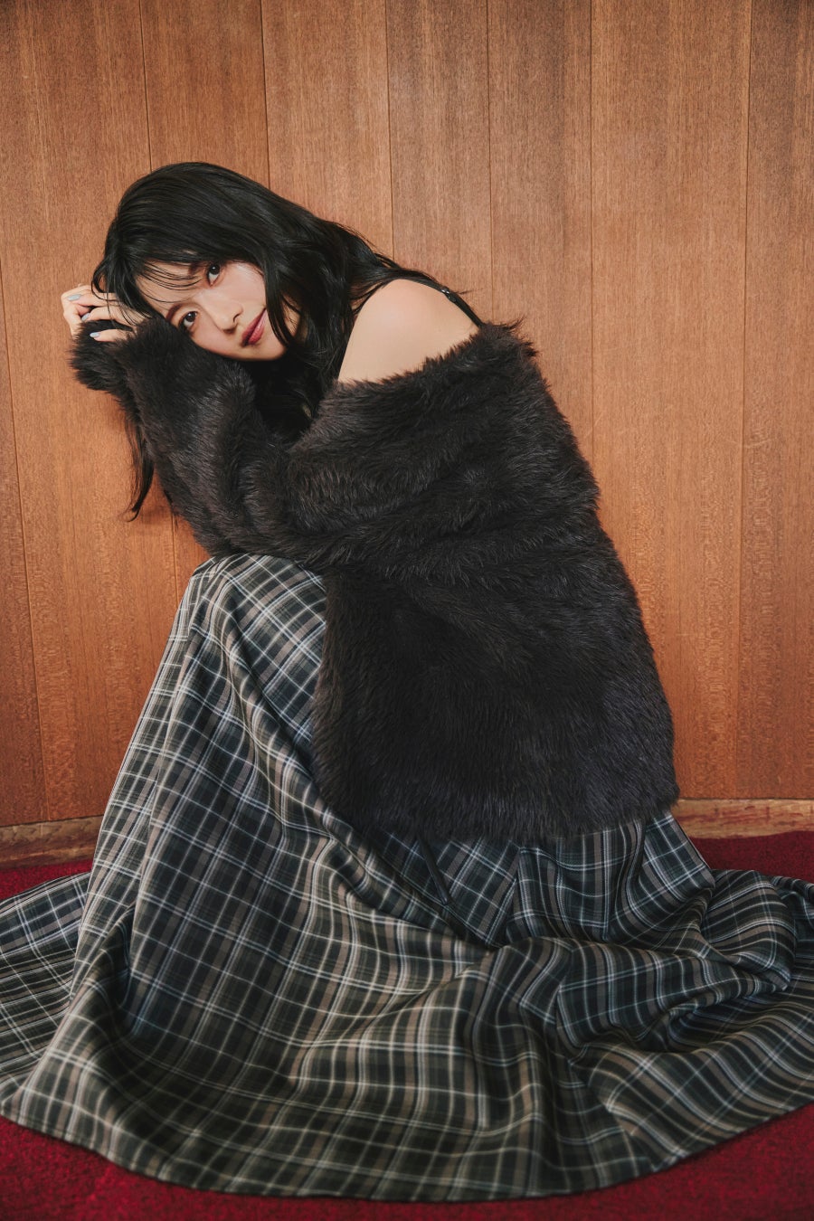 クラシカルなチェック柄にフェイクレザーを合わせた異素材ドッキングワンピースは、とろみのあるシャギーカーディガンを羽織って甘辛MIXなスタイリングに。