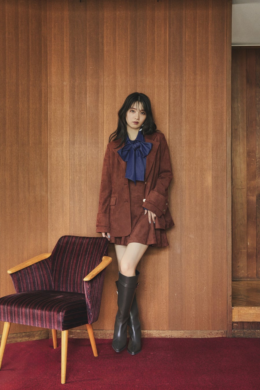 フィット&フレアの凛としたシルエットが美しいジャケットセットアップ。柔らかなスエード生地×デニムライクなシャンブレー生地のコントラストを楽しんで。