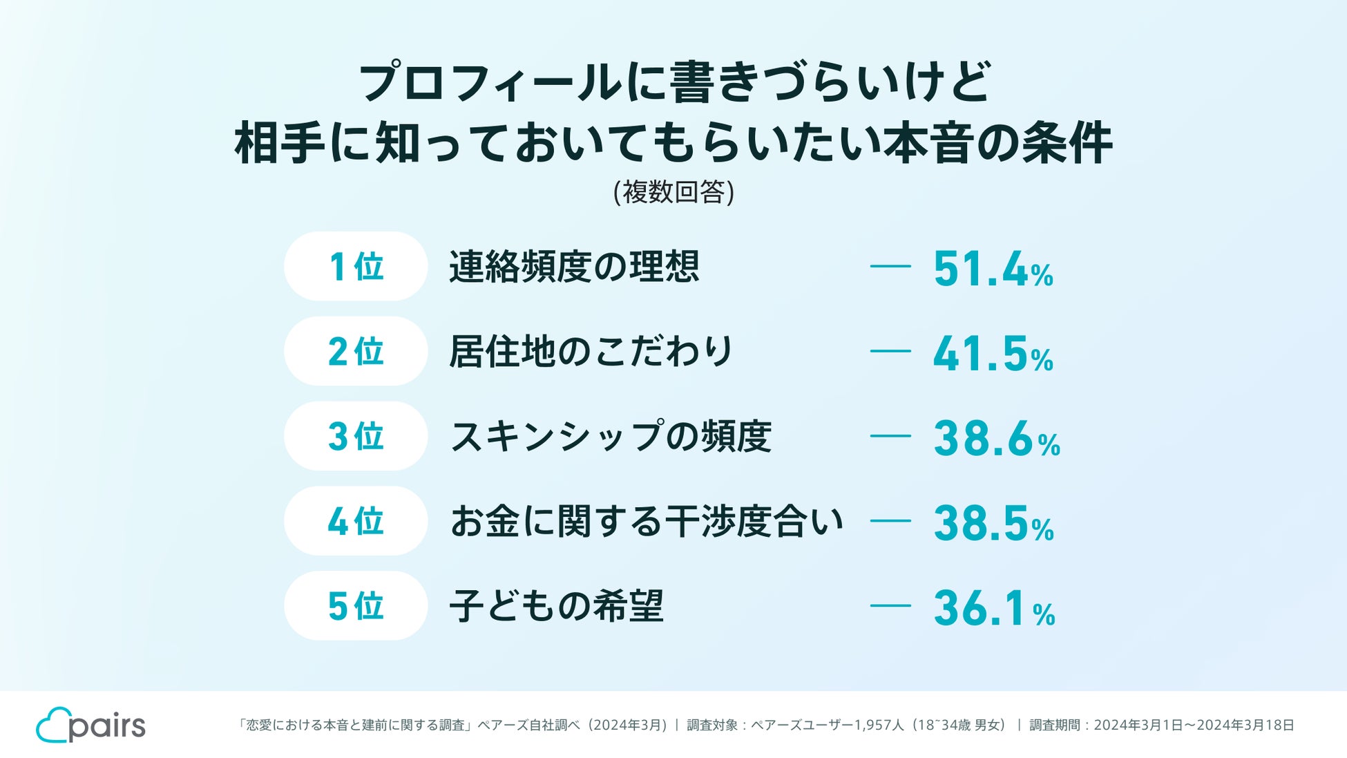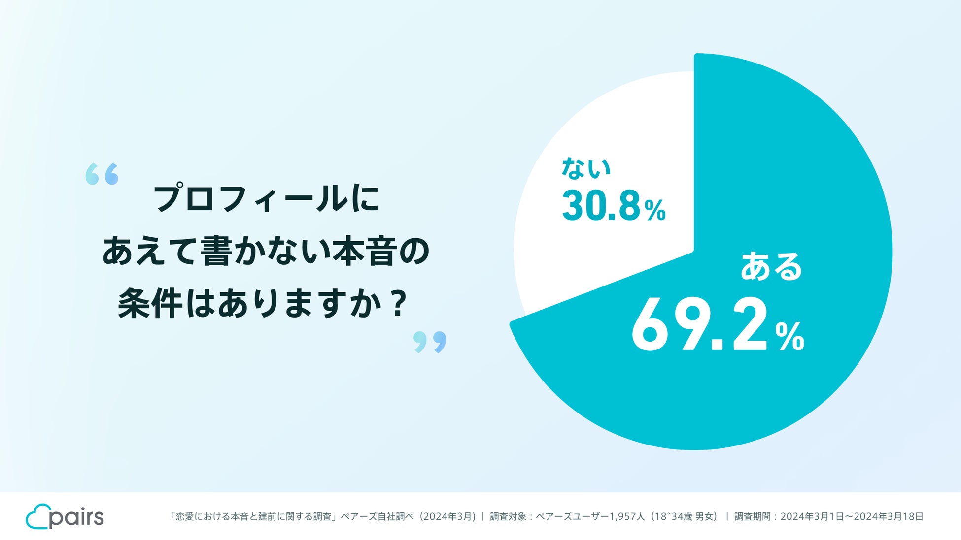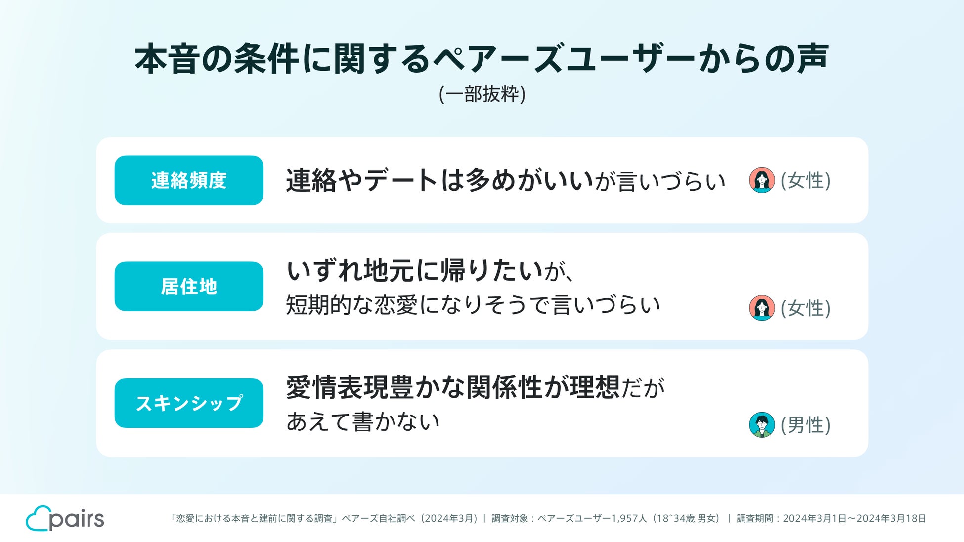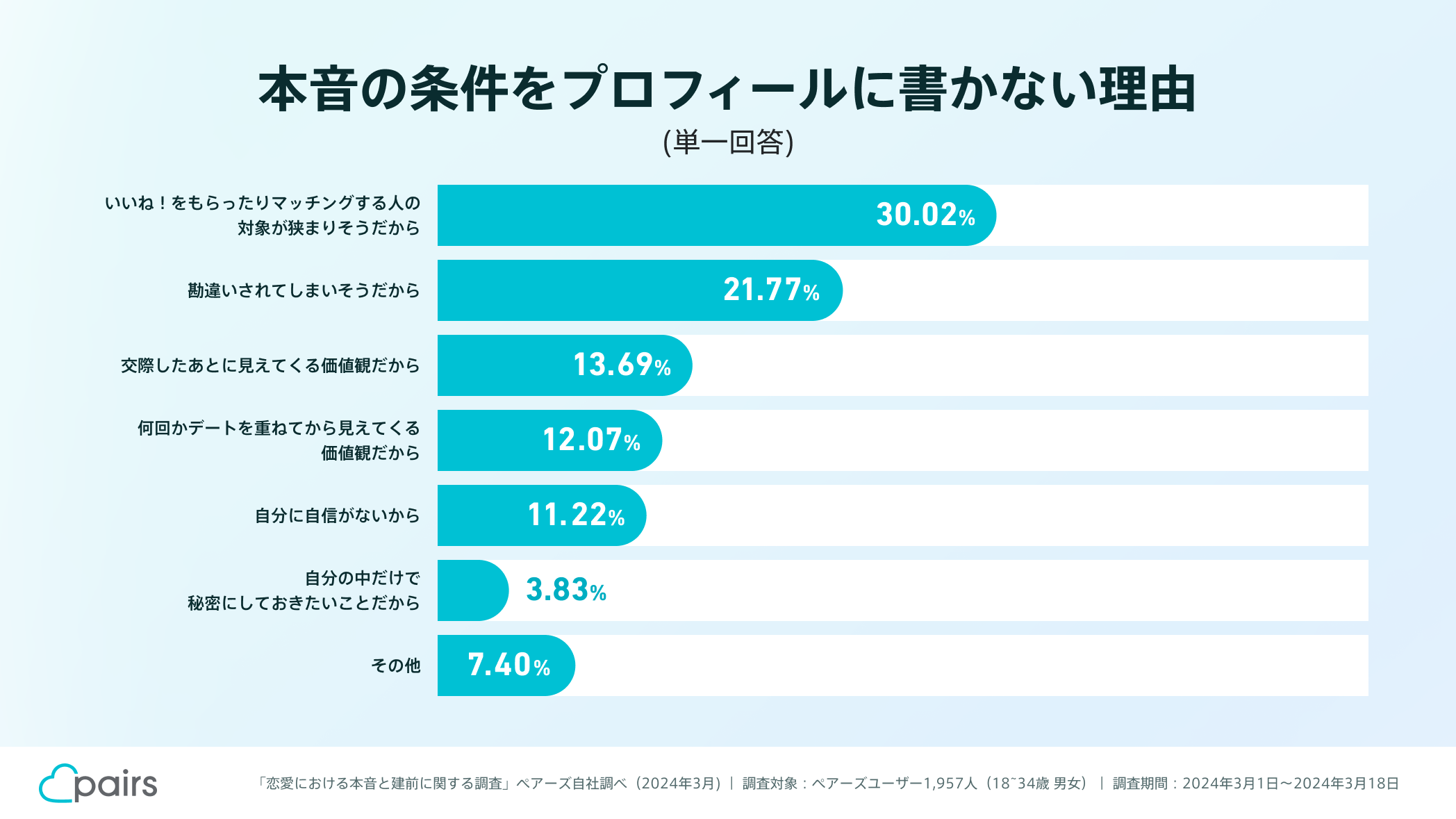 2024年3月に18歳~34歳のペアーズユーザーを対象に行った「恋愛における本音と建前に関する調査」(※1)では、約7割が「ペアーズのプロフィールにあえて書かない本音の条件がある」とし、居住地のこだわりや金銭感覚、スキンシップの頻度などが回答例として挙げられました。またプロフィールに書かない理由として「プロフィールに書くとマッチングする人の対象が狭まったり勘違いされてしまいそうだから」という回答が多く、タイパ重視の若者でも、相手にどう思われるかを気にして本音を言わないことがあるようです。