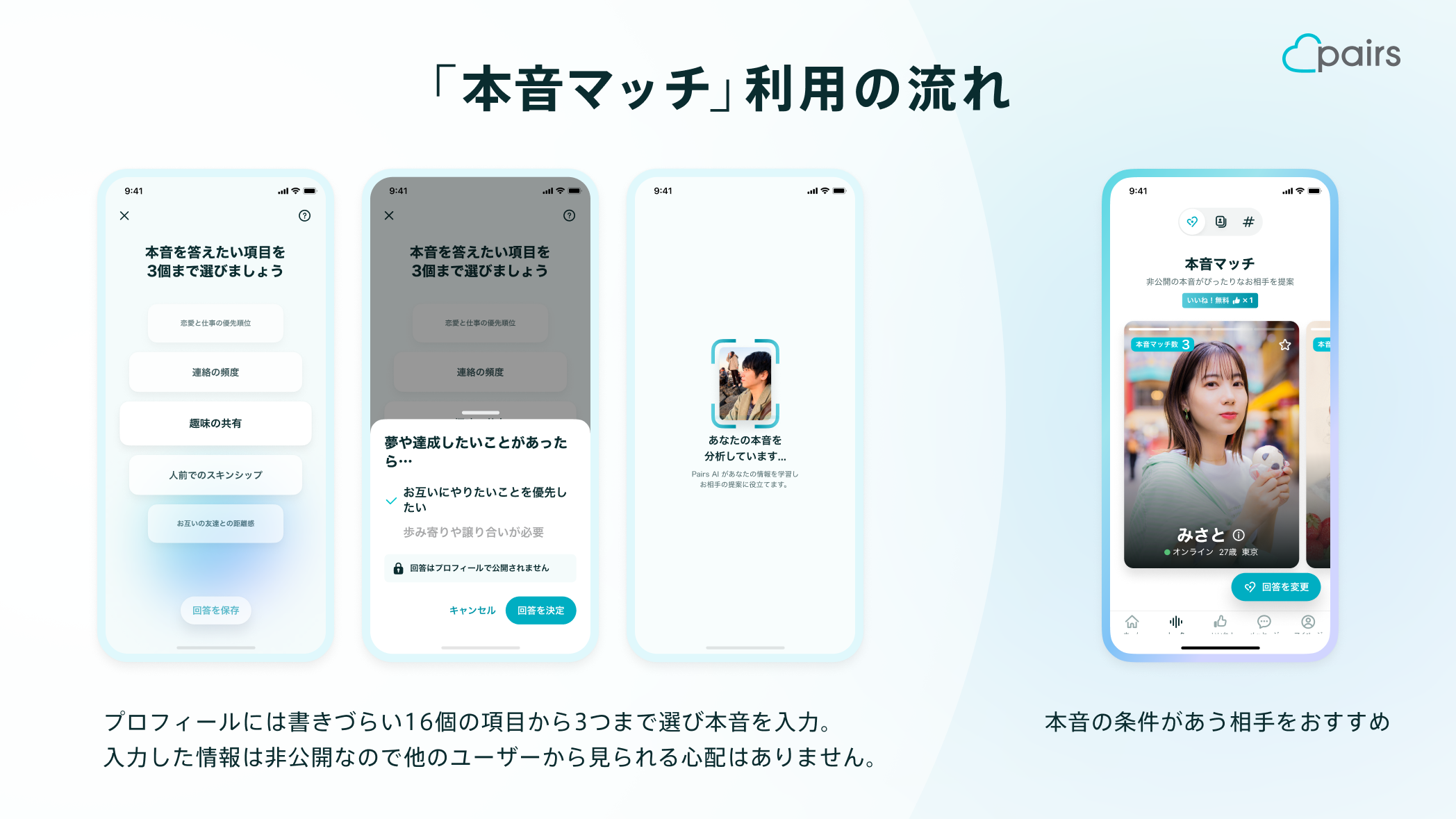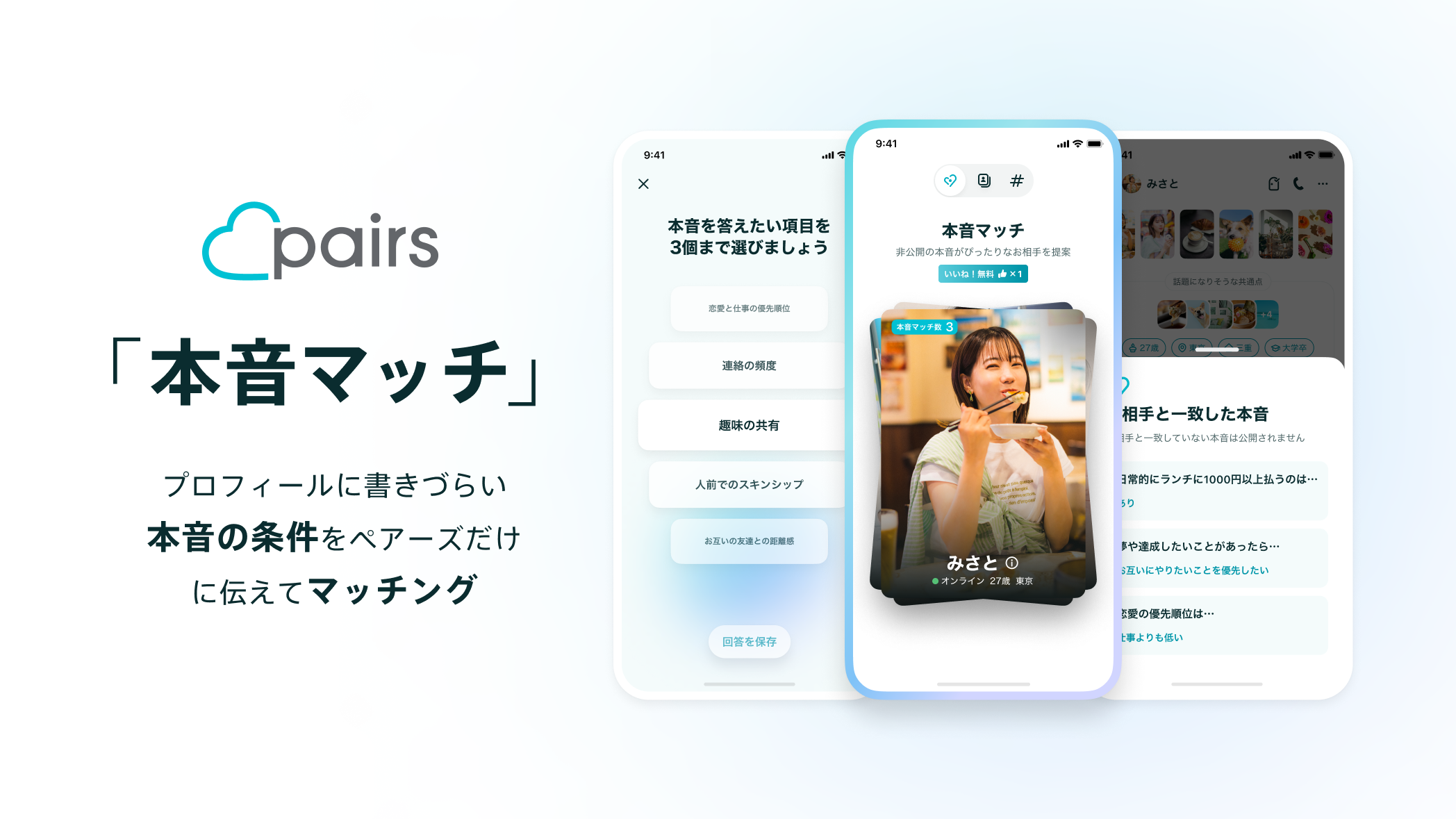 ペアーズ、プロフィールに書きづらい本音の条件でマッチングできる新機能「本音マッチ」提供開始 本音と建前が引き起こす恋のミスマッチを解消