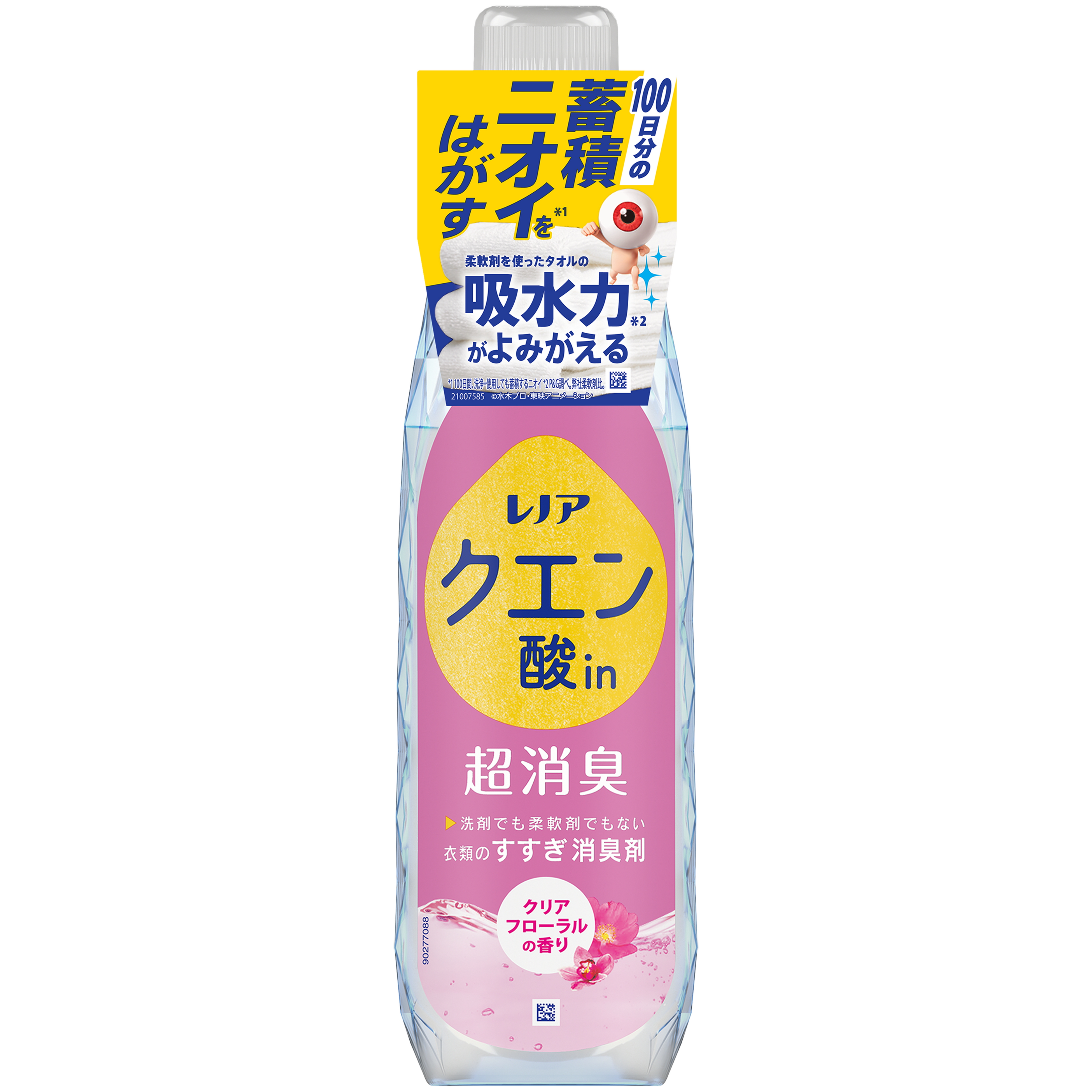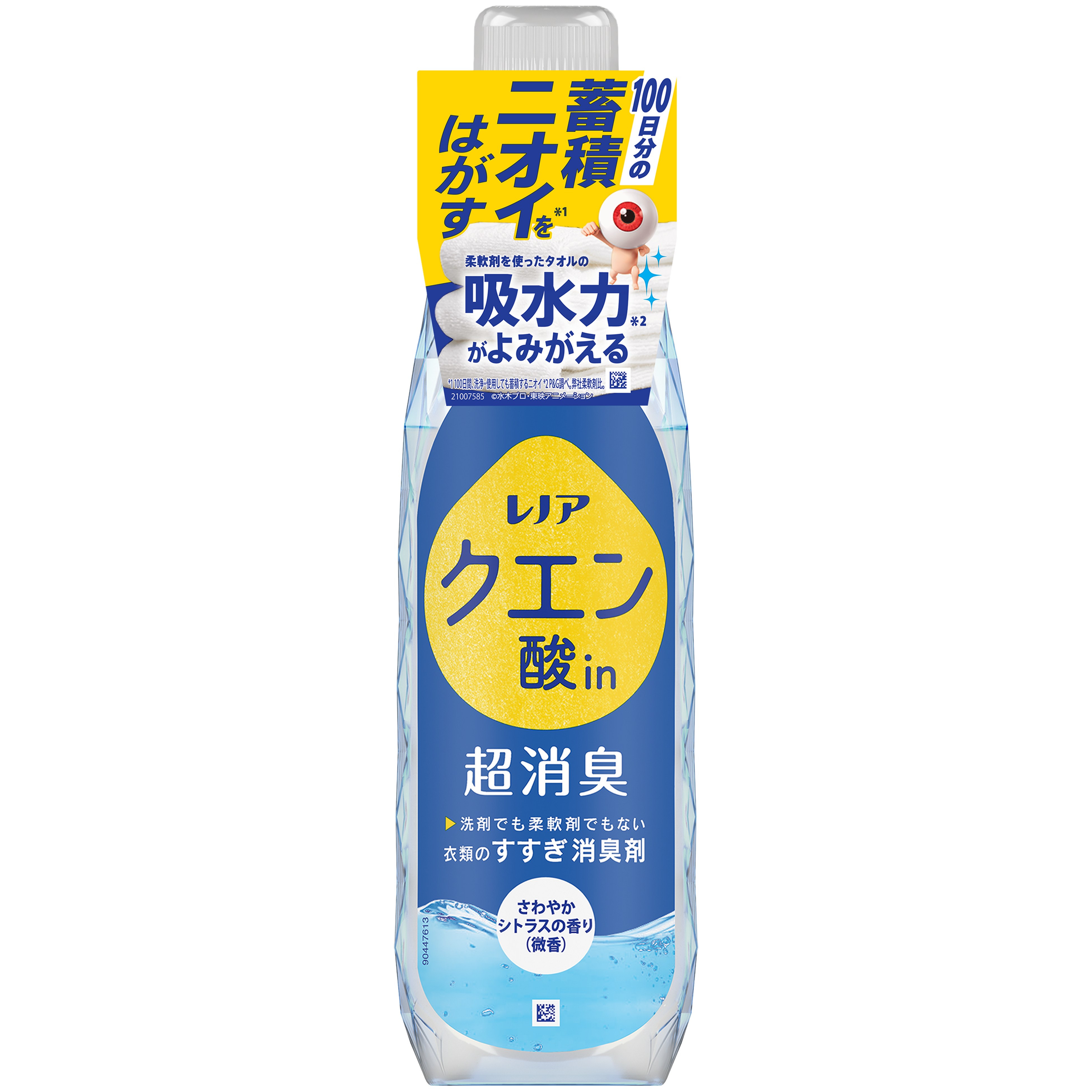 「レノア クエン酸in超消臭」は、2023年7月の発売以来、繰り返し使ってニオイが落ちなくなった布製品もまるで新品のように洗い上げることができる新しいジャンルの『すすぎ消臭剤』としてご好評をいただいております。”100日分の蓄積ニオイ*1”をはがし取ることに加え、柔軟剤を使ったタオルの吸水力がよみがえる*2ことも特長の製品です。本製品は、汚れや洗濯水に含まれる不純物が糊のように衣類の繊維に付着し、蓄積ニオイが生じることに着目して開発されました。汚れた洗濯水と入れ替わり、新たな水が注がれる“すすぎ”の段階で本製品を投入することで、不純物を繊維から取り除き、蓄積ニオイをはがし取ることができます。さらに、柔軟剤を使ったタオルの吸水力を蘇らせる*2こともできます。