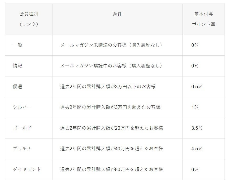 ダイヤモンド会員になるための条件は、過去2年間の購入金額が80万円以上であり、ポイント付与率は6%となります。
