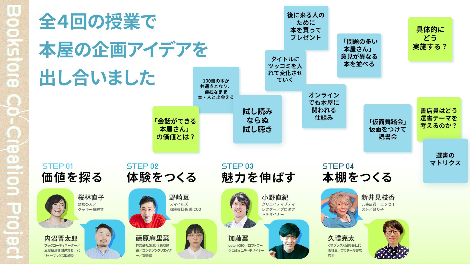 今回、取り組みの第二弾として「本と会話の実験室」を開始し、社会人向け学習プラットフォーム「Schoo」のユーザーと本屋やクリエイティブワークのプロたちが、Schooの生放送授業の中で本屋での新しい体験について一緒に考えました。